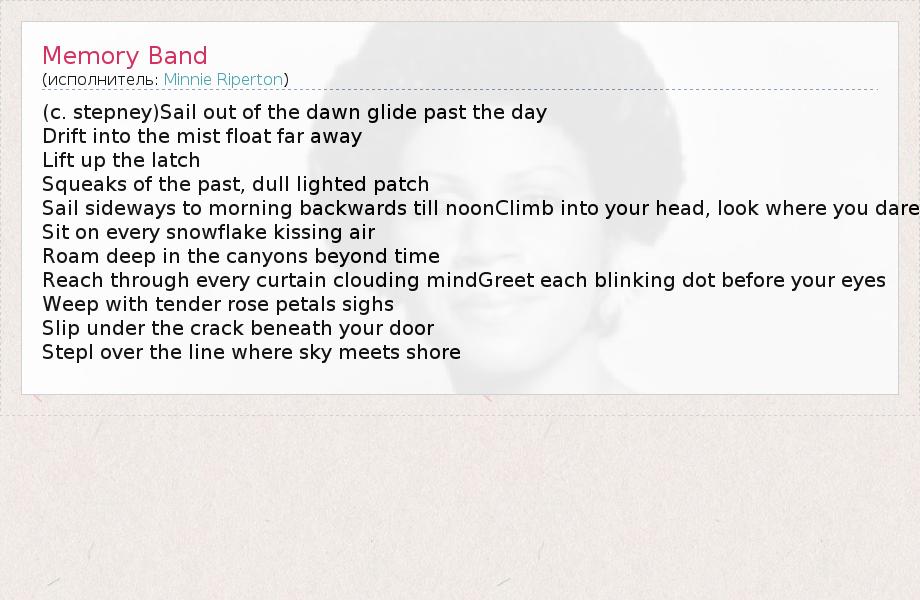 Это интересно:Minnie Julia Riperton (8 ноября 1947 - 12 июля 1979 года)-американская певица, прославившаяся в 1975 синглом "Loving you". Её вокальный диапазон насчитывает пять с половиной октав! В детстве Riperton обучалась музыке, драме, и танцам в Чикагском Линкольн-центре.В подростковом возрасте начала петь в Чикагской женской группе The Gems. Ее ранние связи с легендарной Chess-records предоставили ей возможность петь на бэк-вокале... продолжение
