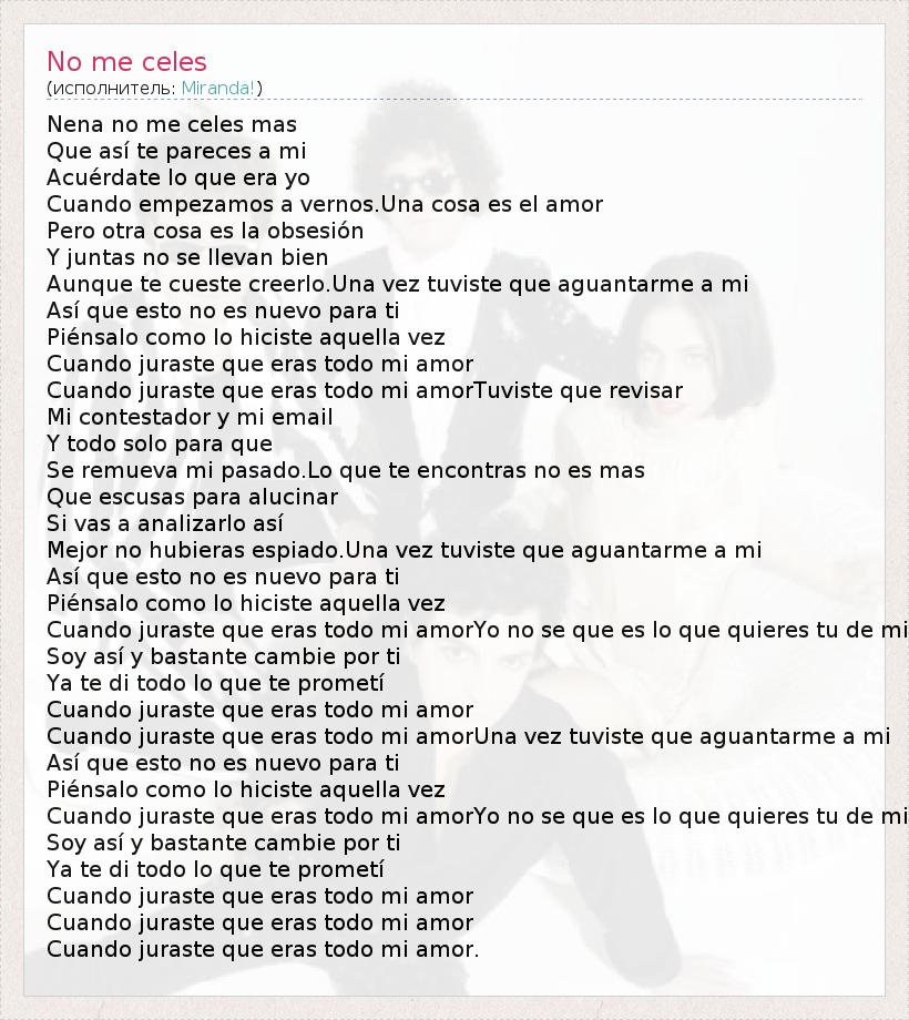 Nena no me celes mas Que así te pareces a mi Acuérdate lo que era yo Cuando empezamos a vernos.Una cosa es el amor Pero otra cosa es la obsesión Y juntas no se llevan bien Aunque te cueste creerlo.Una vez tuviste que aguantarme a mi Así que esto no es nuevo para ti Piénsalo como lo hiciste aquella vez Cuando juraste que eras todo mi amor Cuando juraste que eras todo mi amorTuviste que revisar Mi contestador y mi email Y todo solo para que Se remueva mi pasado.Lo que te encontras no es mas Que escusas para alucinar Si vas a analizarlo así Mejor no hubieras espiado.Una vez tuviste que aguantarme a mi Así que esto no es nuevo para ti Piénsalo como lo hiciste aquella vez Cuando juraste que eras todo mi amorYo no se que es lo que quieres tu de mi Soy así y bastante cambie por ti Ya te di todo lo que te prometí Cuando juraste que eras todo mi amor Cuando juraste que eras todo mi amorUna vez tuviste que aguantarme a mi Así que esto no es nuevo para ti Piénsalo como lo hiciste aquella vez Cuando juraste que eras todo mi amorYo no se que es lo que quieres tu de mi Soy así y bastante cambie por ti Ya te di todo lo que te prometí Cuando juraste que eras todo mi amor Cuando juraste que eras todo mi amor Cuando juraste que eras todo mi amor.