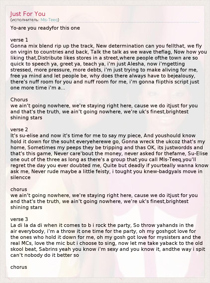 Yo-are you readyfor this one verse 1 Gonna mix blend rip up the track, New determination can you fellthat, we fly on virgin to countries and back, Talk the talk as we wave theflag, Now how you liking that,Distribute likes stores in a street,where people ofthe town are so quick to speech ya, greet ya, teach ya, i'm just Alesha, now i'mgetting stressed, more pressure, more debts, i'm just trying to make aliving for me, free ya mind and let people be, why does there always have to bejealousy, there's nuff room for you and nuff room for me, i'm gonna flipthis script just one more time i'm a... Chorus we ain't going nowhere, we're staying right here, cause we do itjust for you and that's the truth, we ain't going nowhere, we're uk's finest,brightest shining stars verse 2 It's su-elise and now it's time for me to say my piece, And youshould know hold it down for the souht everyeherewe go, Gonna wreck the ukcoz that's my home, Sometimes my peeps they be tripping and thas OK, its justwordds and that's this game, Never care'bout the money, never asked for thefame, Su-Elise one out of the three as long as there's a group that you call MIs-Teeq,you'll regret the day you ever doubted me, Quite but deadly if yourteally wanna know ask me, Never rude maybe a little feisty, i tought you knew-badgyals move in silencce chorus we ain't going nowhere, we're staying right here, cause we do itjust for you and that's the truth, we ain't going nowhere, we're uk's finest,brightest shining stars verse 3 La di la da di when it comes to b i rock the party, So throw yahands in the air everybody, i'm a throw it one time for the party, oh my goshgot love for the ones who hold it down for me, oh my gosh got love for mysisters and the real MCs, love the mic but i choose to sing, now let me take yaback to the old skool beat, Sabrins yeah you know i'm sexy and you know it, andthe way i spit can't nobody do it better so chorus