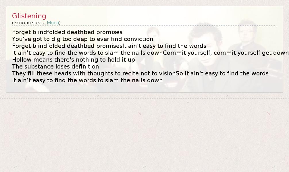 Forget blindfolded deathbed promises You've got to dig too deep to ever find conviction Forget blindfolded deathbed promisesIt ain't easy to find the words It ain't easy to find the words to slam the nails downCommit yourself, commit yourself get down Hollow means there's nothing to hold it up The substance loses definition They fill these heads with thoughts to recite not to visionSo it ain't easy to find the words It ain't easy to find the words to slam the nails down