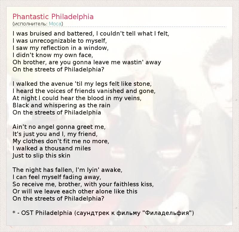 I was bruised and battered, I couldn't tell what I felt, I was unrecognizable to myself, I saw my reflection in a window, I didn't know my own face, Oh brother, are you gonna leave me wastin' away On the streets of Philadelphia? I walked the avenue 'til my legs felt like stone, I heard the voices of friends vanished and gone, At night I could hear the blood in my veins, Black and whispering as the rain On the streets of Philadelphia Ain't no angel gonna greet me, It's just you and I, my friend, My clothes don't fit me no more, I walked a thousand miles Just to slip this skin The night has fallen, I'm lyin' awake, I can feel myself fading away, So receive me, brother, with your faithless kiss, Or will we leave each other alone like this On the streets of Philadelphia? * - OST Philadelphia (саундтрек к фильму "Филадельфия")