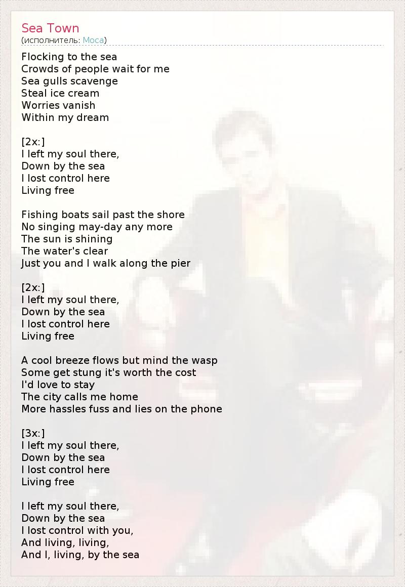 Собравшись у моря, Толпы людей ждут меня. Чайки копаются в мусоре, Цапают мороженое. Тревоги растворяются В моем сне. [2x:] Я оставила душу там, У моря. Потеряла контроль здесь, Живя свободно. Рыбацкие судна у берега. Больше не нужно передавать сигналы бедствия. Светит солнце, Вода чиста. Ты и я прогуливаемся вдоль причала. [2x:] Я оставила душу там, У моря. Потеряла контроль здесь, Живя свободно. Прохладный ветерок, но остерегайся ос - Некоторых уже жалили, но это того стоит. Я бы хотела остаться, Но город зовёт меня домой К спорам, суете и лжи по телефону. [3x:] Я оставила душу там, У моря. Потеряла контроль здесь, Живя свободно. Я оставила душу там, У моря. Потеряла контроль рядом с тобой, И я живу, живу, Живу у моря.