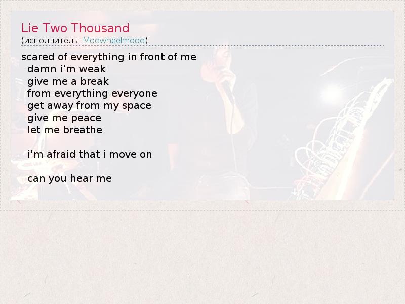 scared of everything in front of me damn i'm weak give me a break from everything everyone get away from my space give me peace let me breathe i'm afraid that i move on can you hear me