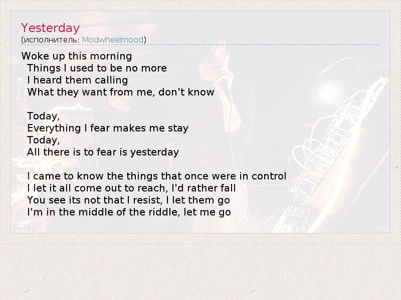 Woke up this morning Things I used to be no more I heard them calling What they want from me, don't know Today, Everything I fear makes me stay Today, All there is to fear is yesterday I came to know the things that once were in control I let it all come out to reach, I'd rather fall You see its not that I resist, I let them go I'm in the middle of the riddle, let me go
