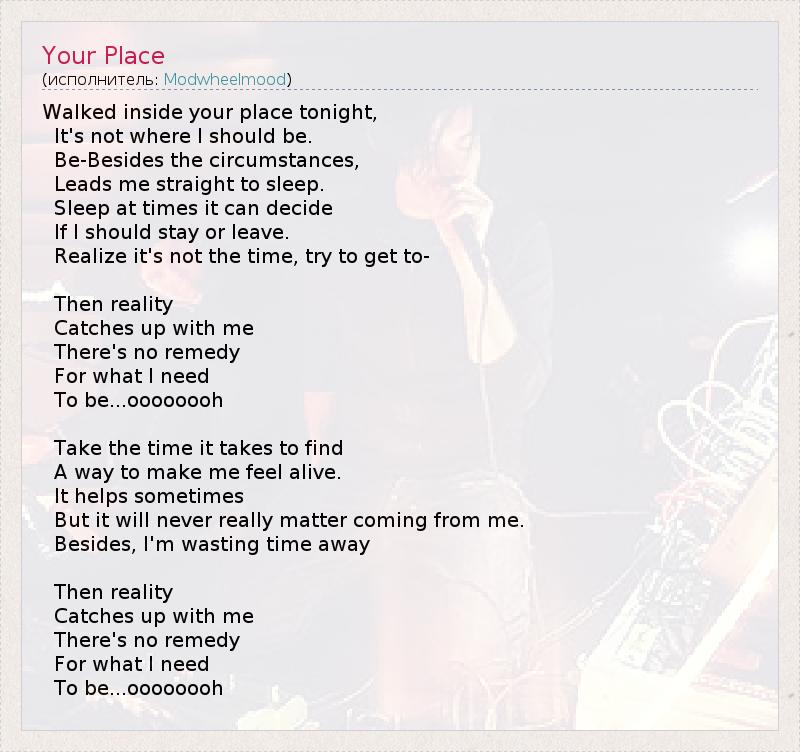 Walked inside your place tonight, It's not where I should be. Be-Besides the circumstances, Leads me straight to sleep. Sleep at times it can decide If I should stay or leave. Realize it's not the time, try to get to- Then reality Catches up with me There's no remedy For what I need To be...oooooooh Take the time it takes to find A way to make me feel alive. It helps sometimes But it will never really matter coming from me. Besides, I'm wasting time away Then reality Catches up with me There's no remedy For what I need To be...oooooooh