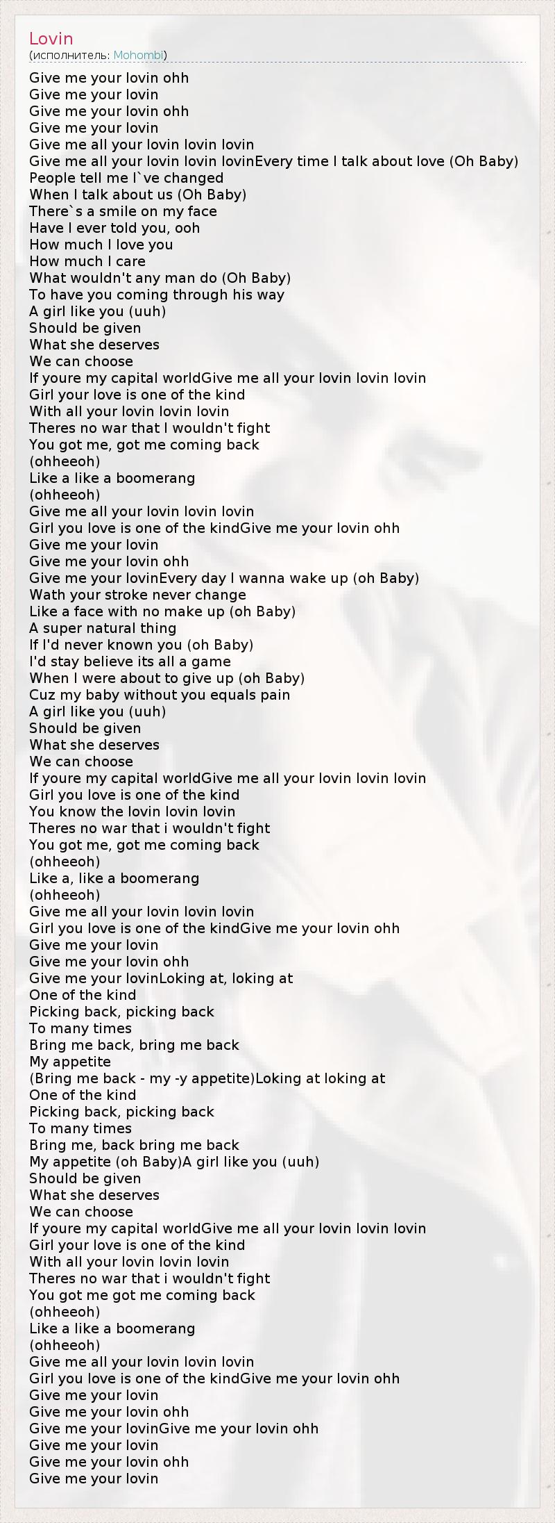 Give me your lovin ohh Give me your lovin Give me your lovin ohh Give me your lovin Give me all your lovin lovin lovin Give me all your lovin lovin lovinEvery time I talk about love (Oh Baby) People tell me I`ve changed When I talk about us (Oh Baby) There`s a smile on my face Have I ever told you, ooh How much I love you How much I care What wouldn't any man do (Oh Baby) To have you coming through his way A girl like you (uuh) Should be given What she deserves We can choose If youre my capital worldGive me all your lovin lovin lovin Girl your love is one of the kind With all your lovin lovin lovin Theres no war that I wouldn't fight You got me, got me coming back (ohheeoh) Like a like a boomerang (ohheeoh) Give me all your lovin lovin lovin Girl you love is one of the kindGive me your lovin ohh Give me your lovin Give me your lovin ohh Give me your lovinEvery day I wanna wake up (oh Baby) Wath your stroke never change Like a face with no make up (oh Baby) A super natural thing If I'd never known you (oh Baby) I'd stay believe its all a game When I were about to give up (oh Baby) Cuz my baby without you equals pain A girl like you (uuh) Should be given What she deserves We can choose If youre my capital worldGive me all your lovin lovin lovin Girl you love is one of the kind You know the lovin lovin lovin Theres no war that i wouldn't fight You got me, got me coming back (ohheeoh) Like a, like a boomerang (ohheeoh) Give me all your lovin lovin lovin Girl you love is one of the kindGive me your lovin ohh Give me your lovin Give me your lovin ohh Give me your lovinLoking at, loking at One of the kind Picking back, picking back To many times Bring me back, bring me back My appetite (Bring me back - my -y appetite)Loking at loking at One of the kind Picking back, picking back To many times Bring me, back bring me back My appetite (oh Baby)A girl like you (uuh) Should be given What she deserves We can choose If youre my capital worldGive me all your lovin lovin lovin Girl your love is one of the kind With all your lovin lovin lovin Theres no war that i wouldn't fight You got me got me coming back (ohheeoh) Like a like a boomerang (ohheeoh) Give me all your lovin lovin lovin Girl you love is one of the kindGive me your lovin ohh Give me your lovin Give me your lovin ohh Give me your lovinGive me your lovin ohh Give me your lovin Give me your lovin ohh Give me your lovin