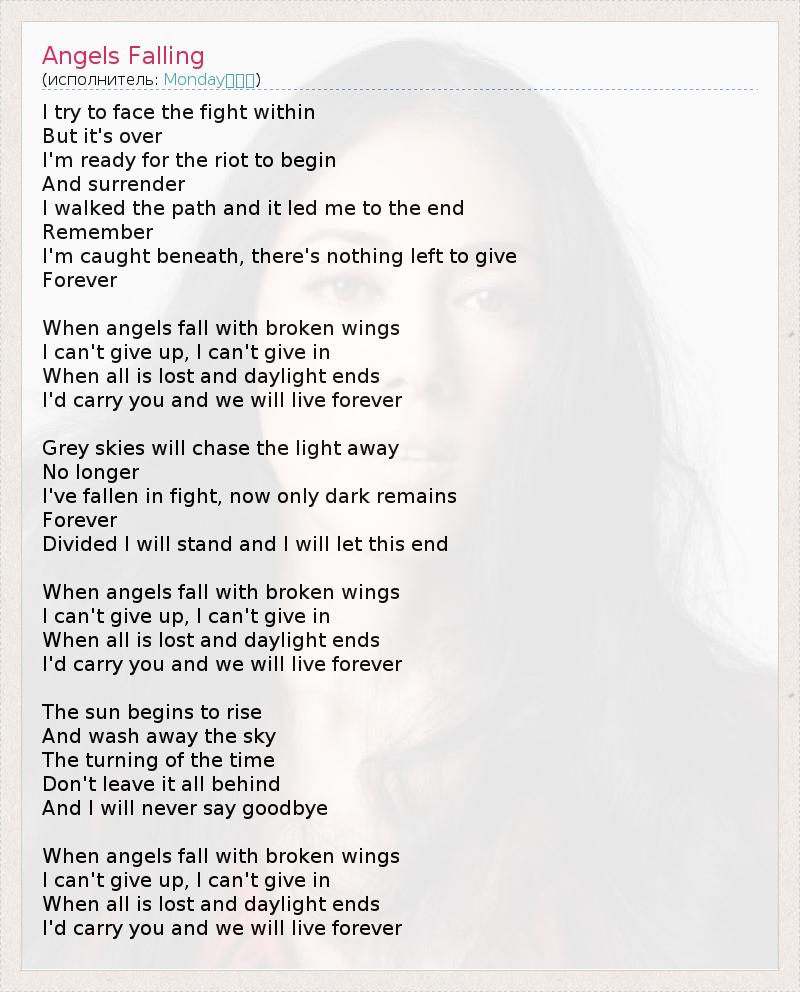 I try to face the fight within But it's over I'm ready for the riot to begin And surrender I walked the path and it led me to the end Remember I'm caught beneath, there's nothing left to give Forever When angels fall with broken wings I can't give up, I can't give in When all is lost and daylight ends I'd carry you and we will live forever Grey skies will chase the light away No longer I've fallen in fight, now only dark remains Forever Divided I will stand and I will let this end When angels fall with broken wings I can't give up, I can't give in When all is lost and daylight ends I'd carry you and we will live forever The sun begins to rise And wash away the sky The turning of the time Don't leave it all behind And I will never say goodbye When angels fall with broken wings I can't give up, I can't give in When all is lost and daylight ends I'd carry you and we will live forever