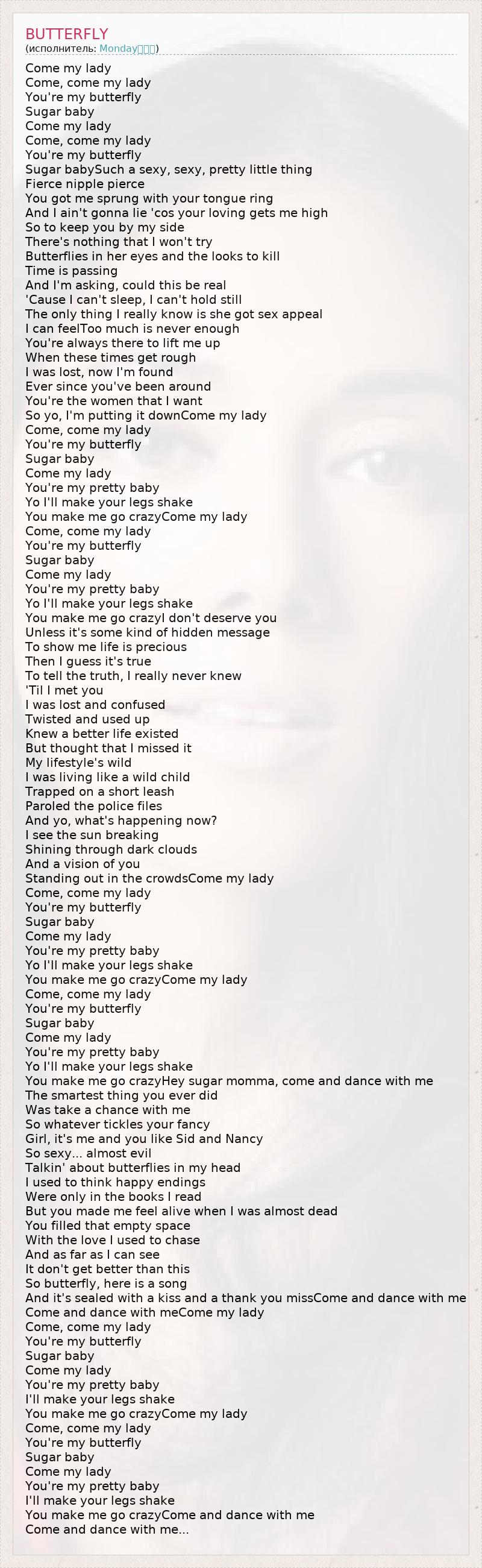 Бабочка Пошли, моя возлюбленная. Пошли, пошли, моя возлюбленная. Ты моя бабочка, Сладкая девочка. Пошли, моя возлюбленная. Пошли, пошли, моя возлюбленная. Ты моя бабочка, Сладкая девочка. Такая безумно сексуальная, симпатичная маленькая штучка – Болезненный пирсинг на соске. Ты взорвала меня своим кольцом на языке. И я не лгу, если говорю, что твои ласки меня возбуждают. Чтобы удержать тебя, я готов перепробовать всё. Из глаз её лучится счастье, и выглядит она сногсшибательно. Время идёт, и я спрашиваю себя, неужели это всё правда? Я не могу спать, я не могу сидеть спокойно. Единственное, что я знаю наверняка, это то, что она сексапильна. Я чувствую, что слишком много для меня всё равно недостаточно. Ты всегда рядом, чтобы приободрить меня в трудные времена. Я был потерян, но я нашёл себя С той поры, как ты появилась в моей жизни. Ты – женщина моей мечты, Поэтому я остановлюсь на этом. Пошли, моя возлюбленная. Пошли, пошли, моя возлюбленная. Ты моя бабочка, Сладкая девочка. Пошли, моя возлюбленная. Ты моя симпатичная девочка. Я сделаю так, что твои ноги задрожат. Ты сводишь меня с ума. Пошли, моя возлюбленная. Пошли, пошли, моя возлюбленная. Ты моя бабочка, Сладкая девочка. Пошли, моя возлюбленная. Ты моя симпатичная девочка. Я сделаю так, что твои ноги задрожат. Ты сводишь меня с ума. Я не заслуживаю тебя. Но встреча с тобой может быть скрытым посланием Мне о том, что жизнь нужно ценить. Теперь я думаю, что это правда. Но, если честно, я не верил в это, пока не встретил тебя. Слышишь, я был потерян и запутан, Обманут и измучен. Я подозревал, что существует лучшая жизнь, Но мне казалось, что я прошёл мимо неё. Я вёл распутный образ жизни, я жил, как дикий ребёнок. Я был на коротком поводке – в полиции на меня завели дело, Но отпустили под честное слово. Так что же происходит сейчас? Я вижу лучи солнца, пробивающиеся сквозь тучи, И твой образ, выделяющийся на фоне толпы. Пошли, моя возлюбленная. Пошли, пошли, моя возлюбленная. Ты моя бабочка, Сладкая девочка. Пошли, моя возлюбленная. Ты моя симпатичная девочка. Я сделаю так, что твои ноги задрожат. Ты сводишь меня с ума. Пошли, моя возлюбленная. Пошли, пошли, моя возлюбленная. Ты моя бабочка, Сладкая девочка. Пошли, моя возлюбленная. Ты моя симпатичная девочка. Я сделаю так, что твои ноги задрожат. Ты сводишь меня с ума. Эй, сладкая мамочка, потанцуй со мной. Самый лучший твой поступок в том, что ты попробовала встречаться со мной. Не важно, что будоражит твоё воображение, Девочка, это я, и тебе нравятся Сид и Нэнси. Твоя соблазнительность имеет в себе что-то дьявольское. Я говорю о своих мечтах. Раньше я думал, что хэппи-энды бывают только в книжках, Но ты заставила меня почувствовать, что я живу, когда я был почти мёртв. Ты заполнила пустое пространство любовью, которую я искал, И мне трудно представить что-либо лучшее. Поэтому бабочка здесь – это песня, отмеченная следом поцелуя И словами благодарности, мисс. Пошли, моя возлюбленная. Пошли, пошли, моя возлюбленная. Ты моя бабочка, Сладкая девочка. Пошли, моя возлюбленная. Ты моя симпатичная девочка. Я сделаю так, что твои ноги задрожат. Ты сводишь меня с ума. Пошли, моя возлюбленная. Пошли, пошли, моя возлюбленная. Ты моя бабочка, Сладкая девочка. Пошли, моя возлюбленная. Ты моя симпатичная девочка. Я сделаю так, что твои ноги задрожат. Ты сводишь меня с ума. Потанцуй со мной, Потанцуй со 