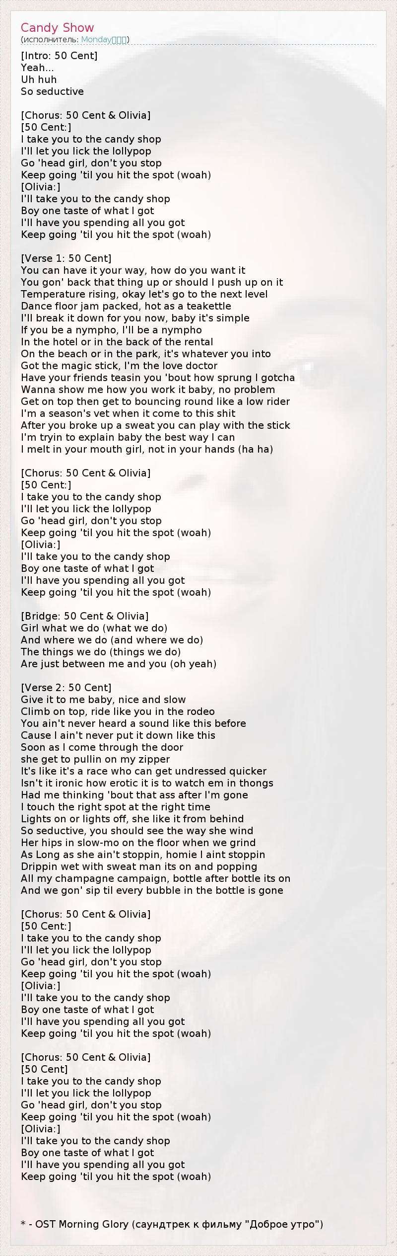 [Intro: 50 Cent] Yeah... Uh huh So seductive [Chorus: 50 Cent & Olivia] [50 Cent:] I take you to the candy shop I'll let you lick the lollypop Go 'head girl, don't you stop Keep going 'til you hit the spot (woah) [Olivia:] I'll take you to the candy shop Boy one taste of what I got I'll have you spending all you got Keep going 'til you hit the spot (woah) [Verse 1: 50 Cent] You can have it your way, how do you want it You gon' back that thing up or should I push up on it Temperature rising, okay let's go to the next level Dance floor jam packed, hot as a teakettle I'll break it down for you now, baby it's simple If you be a nympho, I'll be a nympho In the hotel or in the back of the rental On the beach or in the park, it's whatever you into Got the magic stick, I'm the love doctor Have your friends teasin you 'bout how sprung I gotcha Wanna show me how you work it baby, no problem Get on top then get to bouncing round like a low rider I'm a season's vet when it come to this shit After you broke up a sweat you can play with the stick I'm tryin to explain baby the best way I can I melt in your mouth girl, not in your hands (ha ha) [Chorus: 50 Cent & Olivia] [50 Cent:] I take you to the candy shop I'll let you lick the lollypop Go 'head girl, don't you stop Keep going 'til you hit the spot (woah) [Olivia:] I'll take you to the candy shop Boy one taste of what I got I'll have you spending all you got Keep going 'til you hit the spot (woah) [Bridge: 50 Cent & Olivia] Girl what we do (what we do) And where we do (and where we do) The things we do (things we do) Are just between me and you (oh yeah) [Verse 2: 50 Cent] Give it to me baby, nice and slow Climb on top, ride like you in the rodeo You ain't never heard a sound like this before Cause I ain't never put it down like this Soon as I come through the door she get to pullin on my zipper It's like it's a race who can get undressed quicker Isn't it ironic how erotic it is to watch em in thongs Had me thinking 'bout that ass after I'm gone I touch the right spot at the right time Lights on or lights off, she like it from behind So seductive, you should see the way she wind Her hips in slow-mo on the floor when we grind As Long as she ain't stoppin, homie I aint stoppin Drippin wet with sweat man its on and popping All my champagne campaign, bottle after bottle its on And we gon' sip til every bubble in the bottle is gone [Chorus: 50 Cent & Olivia] [50 Cent:] I take you to the candy shop I'll let you lick the lollypop Go 'head girl, don't you stop Keep going 'til you hit the spot (woah) [Olivia:] I'll take you to the candy shop Boy one taste of what I got I'll have you spending all you got Keep going 'til you hit the spot (woah) [Chorus: 50 Cent & Olivia] [50 Cent] I take you to the candy shop I'll let you lick the lollypop Go 'head girl, don't you stop Keep going 'til you hit the spot (woah) [Olivia:] I'll take you to the candy shop Boy one taste of what I got I'll have you spending all you got Keep going 'til you hit the spot (woah) * - OST Morning Glory (саундтрек к фильму "Доброе утро")