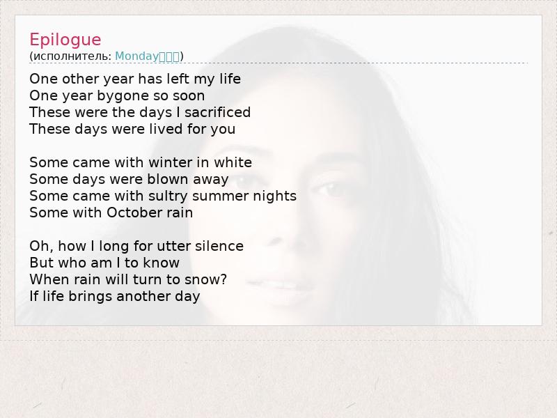 Прошёл ещё один день моей жизни, Год, отживший так скоро. Это были дни, которыми я пожертвовал, Дни, которые я прожил ради тебя. Какие-то принесли зиму в белом, Какие-то дни были унесены прочь, Какие-то принесли душные летние ночи, Какие-то – октябрьский дождь. О, как я жажду полной тишины! Но кто я такой, чтобы знать, Когда дождь сменится снегом, Если жизнь подарит ещё один день...