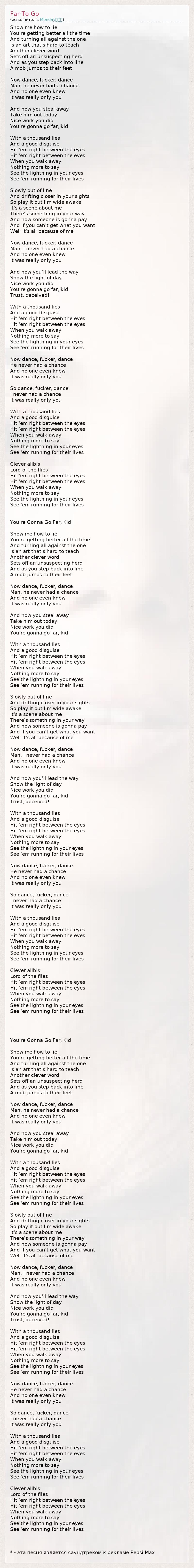 Show me how to lie You're getting better all the time And turning all against the one Is an art that's hard to teach Another clever word Sets off an unsuspecting herd And as you step back into line A mob jumps to their feet Now dance, fucker, dance Man, he never had a chance And no one even knew It was really only you And now you steal away Take him out today Nice work you did You're gonna go far, kid With a thousand lies And a good disguise Hit 'em right between the eyes Hit 'em right between the eyes When you walk away Nothing more to say See the lightning in your eyes See 'em running for their lives Slowly out of line And drifting closer in your sights So play it out I'm wide awake It's a scene about me There's something in your way And now someone is gonna pay And if you can't get what you want Well it's all because of me Now dance, fucker, dance Man, I never had a chance And no one even knew It was really only you And now you'll lead the way Show the light of day Nice work you did You're gonna go far, kid Trust, deceived! With a thousand lies And a good disguise Hit 'em right between the eyes Hit 'em right between the eyes When you walk away Nothing more to say See the lightning in your eyes See 'em running for their lives Now dance, fucker, dance He never had a chance And no one even knew It was really only you So dance, fucker, dance I never had a chance It was really only you With a thousand lies And a good disguise Hit 'em right between the eyes Hit 'em right between the eyes When you walk away Nothing more to say See the lightning in your eyes See 'em running for their lives Clever alibis Lord of the flies Hit 'em right between the eyes Hit 'em right between the eyes When you walk away Nothing more to say See the lightning in your eyes See 'em running for their lives You're Gonna Go Far, Kid Show me how to lie You're getting better all the time And turning all against the one Is an art that's hard to teach Another clever word Sets off an unsuspecting herd And as you step back into line A mob jumps to their feet Now dance, fucker, dance Man, he never had a chance And no one even knew It was really only you And now you steal away Take him out today Nice work you did You're gonna go far, kid With a thousand lies And a good disguise Hit 'em right between the eyes Hit 'em right between the eyes When you walk away Nothing more to say See the lightning in your eyes See 'em running for their lives Slowly out of line And drifting closer in your sights So play it out I'm wide awake It's a scene about me There's something in your way And now someone is gonna pay And if you can't get what you want Well it's all because of me Now dance, fucker, dance Man, I never had a chance And no one even knew It was really only you And now you'll lead the way Show the light of day Nice work you did You're gonna go far, kid Trust, deceived! With a thousand lies And a good disguise Hit 'em right between the eyes Hit 'em right between the eyes When you walk away Nothing more to say See the lightning in your eyes See 'em running for their lives Now dance, fucker, dance He never had a chance And no one even knew It was really only you So dance, fucker, dance I never had a chance It was really only you With a thousand lies And a good disguise Hit 'em right between the eyes Hit 'em right between the eyes When you walk away Nothing more to say See the lightning in your eyes See 'em running for their lives Clever alibis Lord of the flies Hit 'em right between the eyes Hit 'em right between the eyes When you walk away Nothing more to say See the lightning in your eyes See 'em running for their lives You're Gonna Go Far, Kid Show me how to lie You're getting better all the time And turning all against the one Is an art that's hard to teach Another clever word Sets off an unsuspecting herd And as you step back into line A mob jumps to their feet Now dance, fucker, dance Man, he never had a chance And no one even knew It was really only you And now you steal away Take him out today Nice work you did You're gonna go far, kid With a thousand lies And a good disguise Hit 'em right between the eyes Hit 'em right between the eyes When you walk away Nothing more to say See the lightning in your eyes See 'em running for their lives Slowly out of line And drifting closer in your sights So play it out I'm wide awake It's a scene about me There's something in your way And now someone is gonna pay And if you can't get what you want Well it's all because of me Now dance, fucker, dance Man, I never had a chance And no one even knew It was really only you And now you'll lead the way Show the light of day Nice work you did You're gonna go far, kid Trust, deceived! With a thousand lies And a good disguise Hit 'em right between the eyes Hit 'em right between the eyes When you walk away Nothing more to say See the lightning in your eyes See 'em running for their lives Now dance, fucker, dance He never had a chance And no one even knew It was really only you So dance, fucker, dance I never had a chance It was really only you With a thousand lies And a good disguise Hit 'em right between the eyes Hit 'em right between the eyes When you walk away Nothing more to say See the lightning in your eyes See 'em running for their lives Clever alibis Lord of the flies Hit 'em right between the eyes Hit 'em right between the eyes When you walk away Nothing more to say See the lightning in your eyes See 'em running for their lives * - эта песня является саундтреком к рекламе Pepsi Max