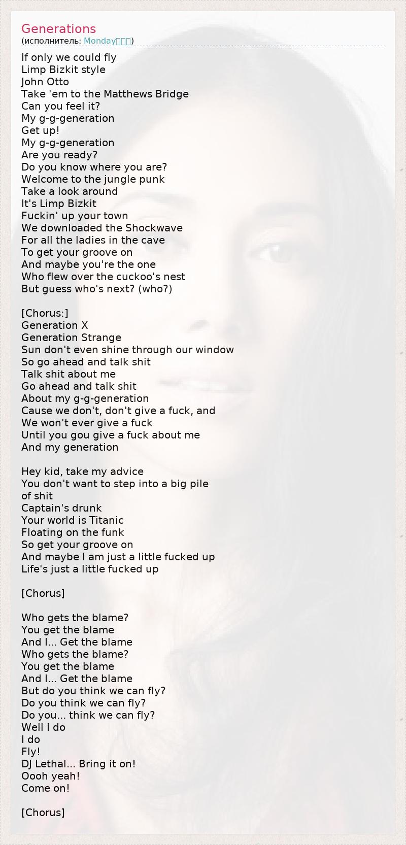 If only we could fly Limp Bizkit style John Otto Take 'em to the Matthews Bridge Can you feel it? My g-g-generation Get up! My g-g-generation Are you ready? Do you know where you are? Welcome to the jungle punk Take a look around It's Limp Bizkit Fuckin' up your town We downloaded the Shockwave For all the ladies in the cave To get your groove on And maybe you're the one Who flew over the cuckoo's nest But guess who's next? (who?) [Chorus:] Generation X Generation Strange Sun don't even shine through our window So go ahead and talk shit Talk shit about me Go ahead and talk shit About my g-g-generation Cause we don't, don't give a fuck, and We won't ever give a fuck Until you gou give a fuck about me And my generation Hey kid, take my advice You don't want to step into a big pile of shit Captain's drunk Your world is Titanic Floating on the funk So get your groove on And maybe I am just a little fucked up Life's just a little fucked up [Chorus] Who gets the blame? You get the blame And I... Get the blame Who gets the blame? You get the blame And I... Get the blame But do you think we can fly? Do you think we can fly? Do you... think we can fly? Well I do I do Fly! DJ Lethal... Bring it on! Oooh yeah! Come on! [Chorus]