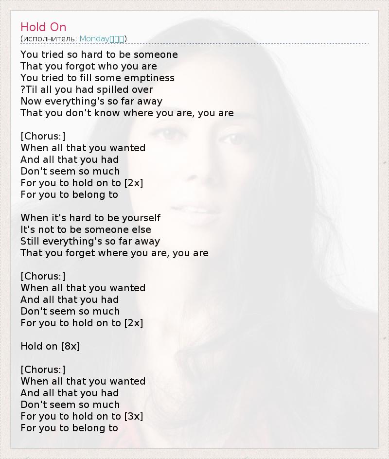 You tried so hard to be someone That you forgot who you are You tried to fill some emptiness ?Til all you had spilled over Now everything's so far away That you don't know where you are, you are [Chorus:] When all that you wanted And all that you had Don't seem so much For you to hold on to [2x] For you to belong to When it's hard to be yourself It's not to be someone else Still everything's so far away That you forget where you are, you are [Chorus:] When all that you wanted And all that you had Don't seem so much For you to hold on to [2x] Hold on [8x] [Chorus:] When all that you wanted And all that you had Don't seem so much For you to hold on to [3x] For you to belong to