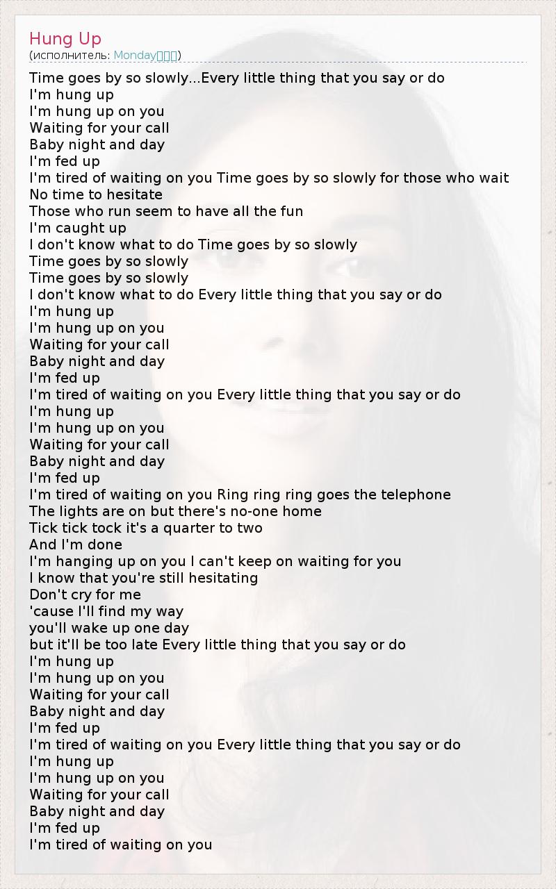 Time goes by so slowly...Every little thing that you say or do I'm hung up I'm hung up on you Waiting for your call Baby night and day I'm fed up I'm tired of waiting on you Time goes by so slowly for those who wait No time to hesitate Those who run seem to have all the fun I'm caught up I don't know what to do Time goes by so slowly Time goes by so slowly Time goes by so slowly I don't know what to do Every little thing that you say or do I'm hung up I'm hung up on you Waiting for your call Baby night and day I'm fed up I'm tired of waiting on you Every little thing that you say or do I'm hung up I'm hung up on you Waiting for your call Baby night and day I'm fed up I'm tired of waiting on you Ring ring ring goes the telephone The lights are on but there's no-one home Tick tick tock it's a quarter to two And I'm done I'm hanging up on you I can't keep on waiting for you I know that you're still hesitating Don't cry for me 'cause I'll find my way you'll wake up one day but it'll be too late Every little thing that you say or do I'm hung up I'm hung up on you Waiting for your call Baby night and day I'm fed up I'm tired of waiting on you Every little thing that you say or do I'm hung up I'm hung up on you Waiting for your call Baby night and day I'm fed up I'm tired of waiting on you