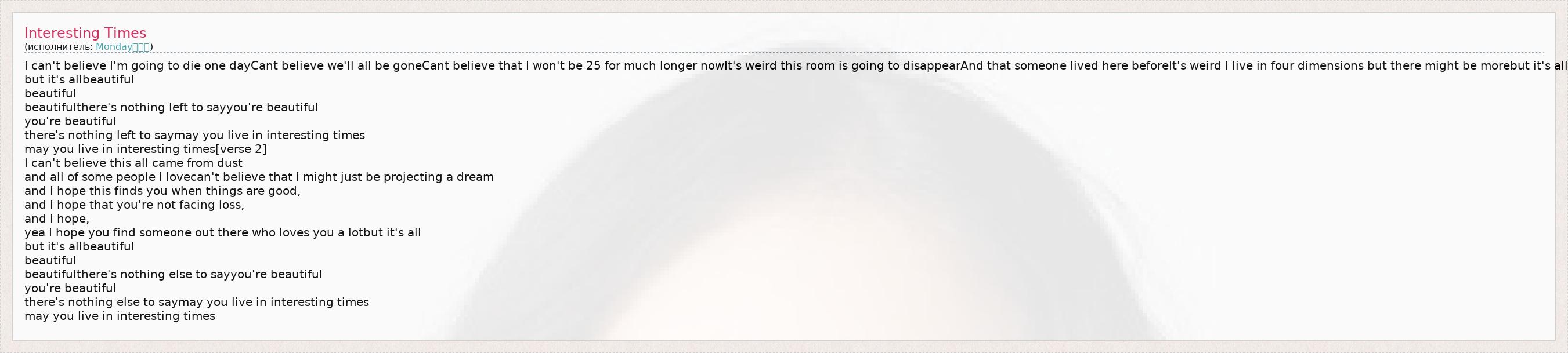 I can't believe I'm going to die one dayCant believe we'll all be goneCant believe that I won't be 25 for much longer nowIt's weird this room is going to disappearAnd that someone lived here beforeIt's weird I live in four dimensions but there might be morebut it's all but it's allbeautiful beautiful beautifulthere's nothing left to sayyou're beautiful you're beautiful there's nothing left to saymay you live in interesting times may you live in interesting times[verse 2] I can't believe this all came from dust and all of some people I lovecan't believe that I might just be projecting a dream and I hope this finds you when things are good, and I hope that you're not facing loss, and I hope, yea I hope you find someone out there who loves you a lotbut it's all but it's allbeautiful beautiful beautifulthere's nothing else to sayyou're beautiful you're beautiful there's nothing else to saymay you live in interesting times may you live in interesting times