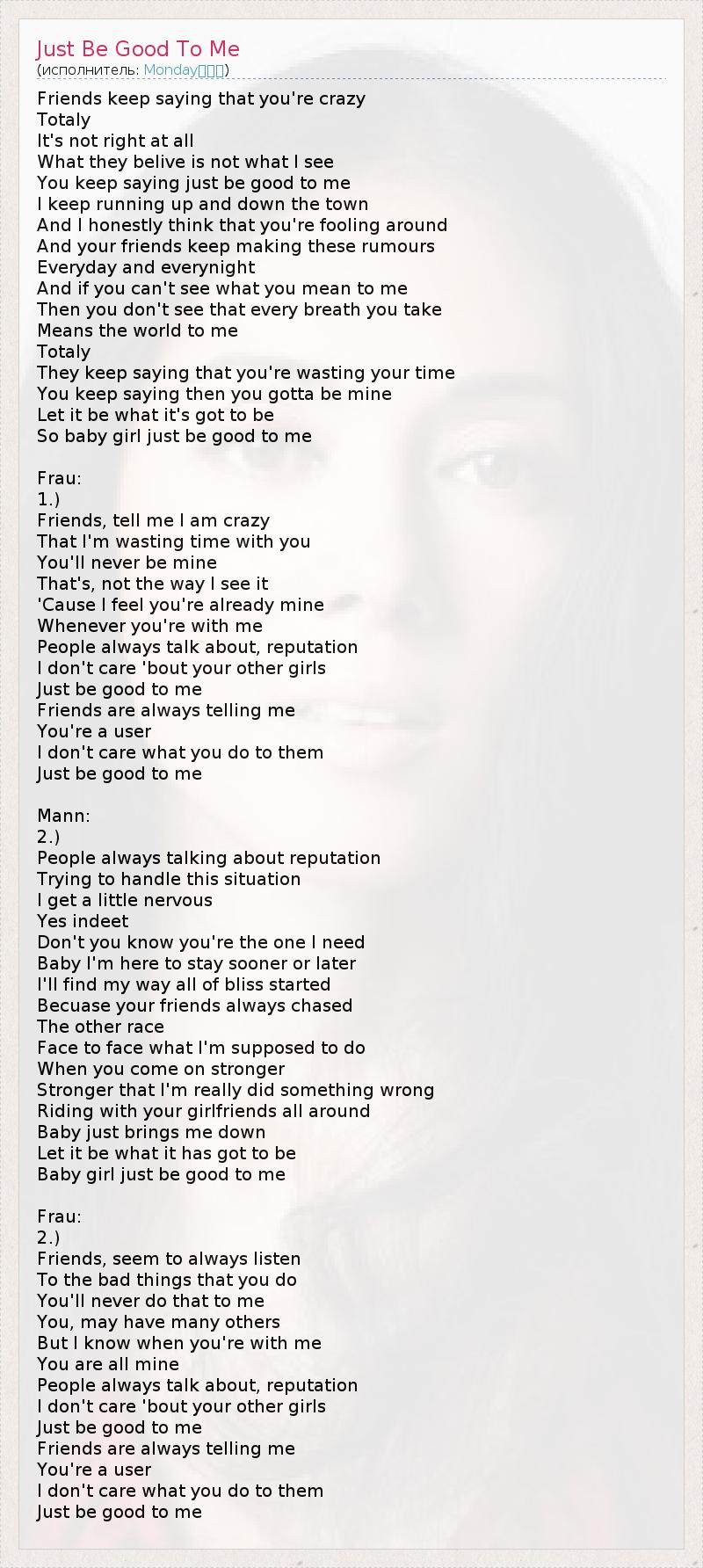 Friends keep saying that you're crazy Totaly It's not right at all What they belive is not what I see You keep saying just be good to me I keep running up and down the town And I honestly think that you're fooling around And your friends keep making these rumours Everyday and everynight And if you can't see what you mean to me Then you don't see that every breath you take Means the world to me Totaly They keep saying that you're wasting your time You keep saying then you gotta be mine Let it be what it's got to be So baby girl just be good to me Frau: 1.) Friends, tell me I am crazy That I'm wasting time with you You'll never be mine That's, not the way I see it 'Cause I feel you're already mine Whenever you're with me People always talk about, reputation I don't care 'bout your other girls Just be good to me Friends are always telling me You're a user I don't care what you do to them Just be good to me Mann: 2.) People always talking about reputation Trying to handle this situation I get a little nervous Yes indeet Don't you know you're the one I need Baby I'm here to stay sooner or later I'll find my way all of bliss started Becuase your friends always chased The other race Face to face what I'm supposed to do When you come on stronger Stronger that I'm really did something wrong Riding with your girlfriends all around Baby just brings me down Let it be what it has got to be Baby girl just be good to me Frau: 2.) Friends, seem to always listen To the bad things that you do You'll never do that to me You, may have many others But I know when you're with me You are all mine People always talk about, reputation I don't care 'bout your other girls Just be good to me Friends are always telling me You're a user I don't care what you do to them Just be good to me