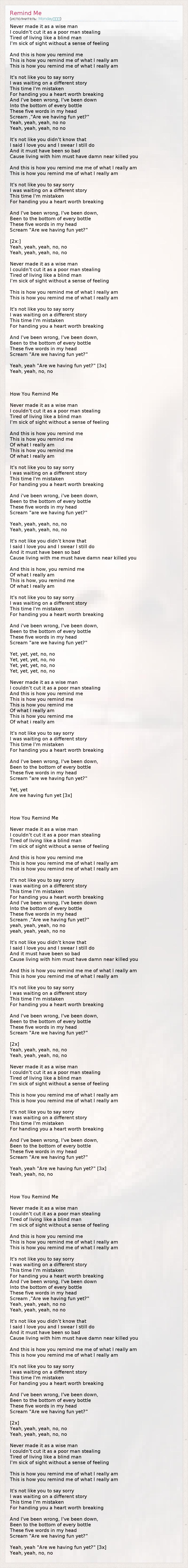 Never made it as a wise man I couldn't cut it as a poor man stealing Tired of living like a blind man I'm sick of sight without a sense of feeling And this is how you remind me This is how you remind me of what I really am This is how you remind me of what I really am It's not like you to say sorry I was waiting on a different story This time I'm mistaken For handing you a heart worth breaking And I've been wrong, I've been down Into the bottom of every bottle These five words in my head Scream ,"Are we having fun yet?" Yeah, yeah, yeah, no no Yeah, yeah, yeah, no no It's not like you didn't know that I said I love you and I swear I still do And it must have been so bad Cause living with him must have damn near killed you And this is how you remind me me of what I really am This is how you remind me of what I really am It's not like you to say sorry I was waiting on a different story This time I'm mistaken For handing you a heart worth breaking And I've been wrong, I've been down, Been to the bottom of every bottle These five words in my head Scream "Are we having fun yet?" [2x:] Yeah, yeah, yeah, no, no Yeah, yeah, yeah, no, no Never made it as a wise man I couldn't cut it as a poor man stealing Tired of living like a blind man I'm sick of sight without a sense of feeling This is how you remind me of what I really am This is how you remind me of what I really am It's not like you to say sorry I was waiting on a different story This time I'm mistaken For handing you a heart worth breaking And I've been wrong, I've been down, Been to the bottom of every bottle These five words in my head Scream "Are we having fun yet?" Yeah, yeah "Are we having fun yet?" [3x] Yeah, yeah, no, no How You Remind Me Never made it as a wise man I couldn't cut it as a poor man stealing Tired of living like a blind man I'm sick of sight without a sense of feeling And this is how you remind me This is how you remind me Of what I really am This is how you remind me Of what I really am It's not like you to say sorry I was waiting on a different story This time I'm mistaken For handing you a heart worth breaking And i've been wrong, i've been down, Been to the bottom of every bottle These five words in my head Scream "are we having fun yet?" Yeah, yeah, yeah, no, no Yeah, yeah, yeah, no, no It's not like you didn't know that I said I love you and I swear I still do And it must have been so bad Cause living with me must have damn near killed you And this is how, you remind me Of what I really am This is how, you remind me Of what I really am It's not like you to say sorry I was waiting on a different story This time I'm mistaken For handing you a heart worth breaking And i've been wrong, I've been down, Been to the bottom of every bottle These five words in my head Scream "are we having fun yet?" Yet, yet, yet, no, no Yet, yet, yet, no, no Yet, yet, yet, no, no Yet, yet, yet, no, no Never made it as a wise man I couldn't cut it as a poor man stealing And this is how you remind me This is how you remind me This is how you remind me Of what I really am This is how you remind me Of what i really am It's not like you to say sorry I was waiting on a different story This time I'm mistaken For handing you a heart worth breaking And I've been wrong, I've been down, Been to the bottom of every bottle These five words in my head Scream "are we having fun yet?" Yet, yet Are we having fun yet [3x] How You Remind Me Never made it as a wise man I couldn't cut it as a poor man stealing Tired of living like a blind man I'm sick of sight without a sense of feeling And this is how you remind me This is how you remind me of what I really am This is how you remind me of what I really am It's not like you to say sorry I was waiting on a different story This time I'm mistaken For handing you a heart worth breaking And I've been wrong, I've been down Into the bottom of every bottle These five words in my head Scream ,"Are we having fun yet?" yeah, yeah, yeah, no no yeah, yeah, yeah, no no It's not like you didn't know that I said I love you and I swear I still do And it must have been so bad Cause living with him must have damn near killed you And this is how you remind me me of what I really am This is how you remind me of what I really am It's not like you to say sorry I was waiting on a different story This time I'm mistaken For handing you a heart worth breaking And I've been wrong, I've been down, Been to the bottom of every bottle These five words in my head Scream "Are we having fun yet?" [2x] Yeah, yeah, yeah, no, no Yeah, yeah, yeah, no, no Never made it as a wise man I couldn't cut it as a poor man stealing Tired of living like a blind man I'm sick of sight without a sense of feeling This is how you remind me of what I really am This is how you remind me of what I really am It's not like you to say sorry I was waiting on a different story This time I'm mistaken For handing you a heart worth breaking And I've been wrong, I've been down, Been to the bottom of every bottle These five words in my head Scream "Are we having fun yet?" Yeah, yeah "Are we having fun yet?" [3x] Yeah, yeah, no, no How You Remind Me Never made it as a wise man I couldn't cut it as a poor man stealing Tired of living like a blind man I'm sick of sight without a sense of feeling And this is how you remind me This is how you remind me of what I really am This is how you remind me of what I really am It's not like you to say sorry I was waiting on a different story This time I'm mistaken For handing you a heart worth breaking And I've been wrong, I've been down Into the bottom of every bottle These five words in my head Scream ,"Are we having fun yet?" Yeah, yeah, yeah, no no Yeah, yeah, yeah, no no It's not like you didn't know that I said I love you and I swear I still do And it must have been so bad Cause living with him must have damn near killed you And this is how you remind me me of what I really am This is how you remind me of what I really am It's not 