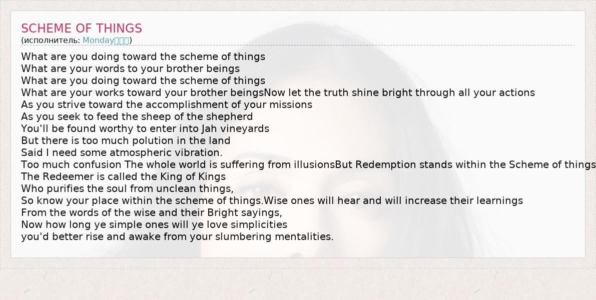 What are you doing toward the scheme of things What are your words to your brother beings What are you doing toward the scheme of things What are your works toward your brother beingsNow let the truth shine bright through all your actions As you strive toward the accomplishment of your missions As you seek to feed the sheep of the shepherd You'll be found worthy to enter into Jah vineyards But there is too much polution in the land Said I need some atmospheric vibration. Too much confusion The whole world is suffering from illusionsBut Redemption stands within the Scheme of things The Redeemer is called the King of Kings Who purifies the soul from unclean things, So know your place within the scheme of things.Wise ones will hear and will increase their learnings From the words of the wise and their Bright sayings, Now how long ye simple ones will ye love simplicities you'd better rise and awake from your slumbering mentalities.