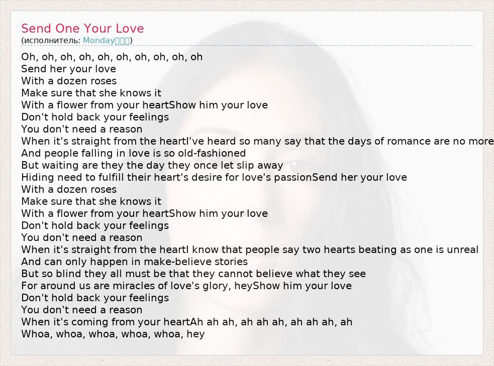 Oh, oh, oh, oh, oh, oh, oh, oh, oh, oh Send her your love With a dozen roses Make sure that she knows it With a flower from your heartShow him your love Don't hold back your feelings You don't need a reason When it's straight from the heartI've heard so many say that the days of romance are no more And people falling in love is so old-fashioned But waiting are they the day they once let slip away Hiding need to fulfill their heart's desire for love's passionSend her your love With a dozen roses Make sure that she knows it With a flower from your heartShow him your love Don't hold back your feelings You don't need a reason When it's straight from the heartI know that people say two hearts beating as one is unreal And can only happen in make-believe stories But so blind they all must be that they cannot believe what they see For around us are miracles of love's glory, heyShow him your love Don't hold back your feelings You don't need a reason When it's coming from your heartAh ah ah, ah ah ah, ah ah ah, ah Whoa, whoa, whoa, whoa, whoa, hey