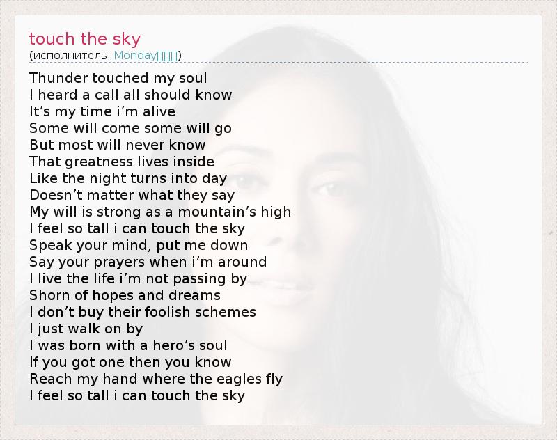 Thunder touched my soul I heard a call all should know It’s my time i’m alive Some will come some will go But most will never know That greatness lives inside Like the night turns into day Doesn’t matter what they say My will is strong as a mountain’s high I feel so tall i can touch the sky Speak your mind, put me down Say your prayers when i’m around I live the life i’m not passing by Shorn of hopes and dreams I don’t buy their foolish schemes I just walk on by I was born with a hero’s soul If you got one then you know Reach my hand where the eagles fly I feel so tall i can touch the sky