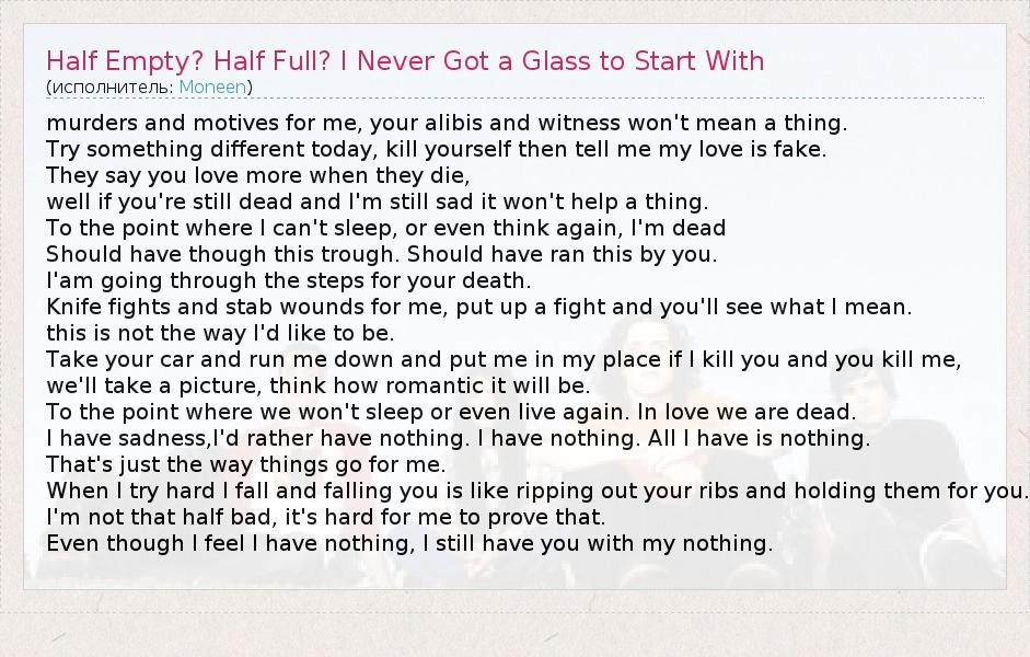 А как ты думаешь, о чем песня "Half Empty? Half Full? I Never Got a Glass to Start With" ?