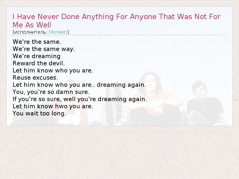ГлавнаяИсполнителиMoneenI Have Never Done Anything For Anyone That Was Not For Me As Well