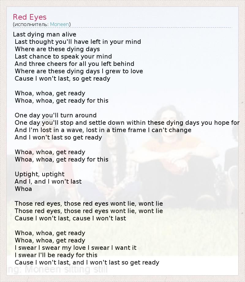 Last dying man alive Last thought you'll have left in your mind Where are these dying days Last chance to speak your mind And three cheers for all you left behind Where are these dying days I grew to love Cause I won't last, so get ready Whoa, whoa, get ready Whoa, whoa, get ready for this One day you'll turn around One day you'll stop and settle down within these dying days you hope for And I'm lost in a wave, lost in a time frame I can't change And I won't last so get ready Whoa, whoa, get ready Whoa, whoa, get ready for this Uptight, uptight And I, and I won't last Whoa Those red eyes, those red eyes wont lie, wont lie Those red eyes, those red eyes wont lie, wont lie Cause I won't last, cause I won't last Whoa, whoa, get ready Whoa, whoa, get ready I swear I swear my love I swear I want it I swear I'll be ready for this Cause I won't last, and I won't last so get ready