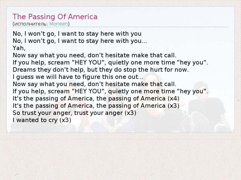 No, I won't go, I want to stay here with you No, I won't go, I want to stay here with you... Yah, Now say what you need, don't hesitate make that call. If you help, scream "HEY YOU", quietly one more time "hey you". Dreams they don't help, but they do stop the hurt for now. I guess we will have to figure this one out... Now say what you need, don't hesitate make that call. If you help, scream "HEY YOU", quietly one more time "hey you". It's the passing of America, the passing of America (x4) It's the passing of America, the passing of America (x3) So trust your anger, trust your anger (x3) I wanted to cry (x3)