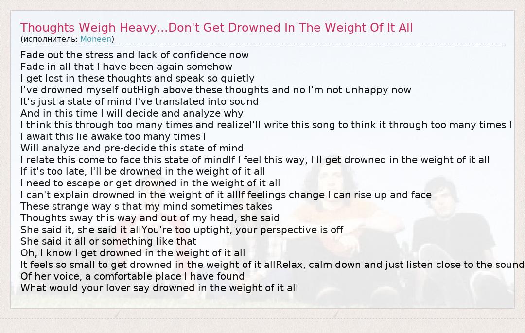 ГлавнаяИсполнителиMoneenThoughts Weigh Heavy...Don't Get Drowned In The Weight Of It All