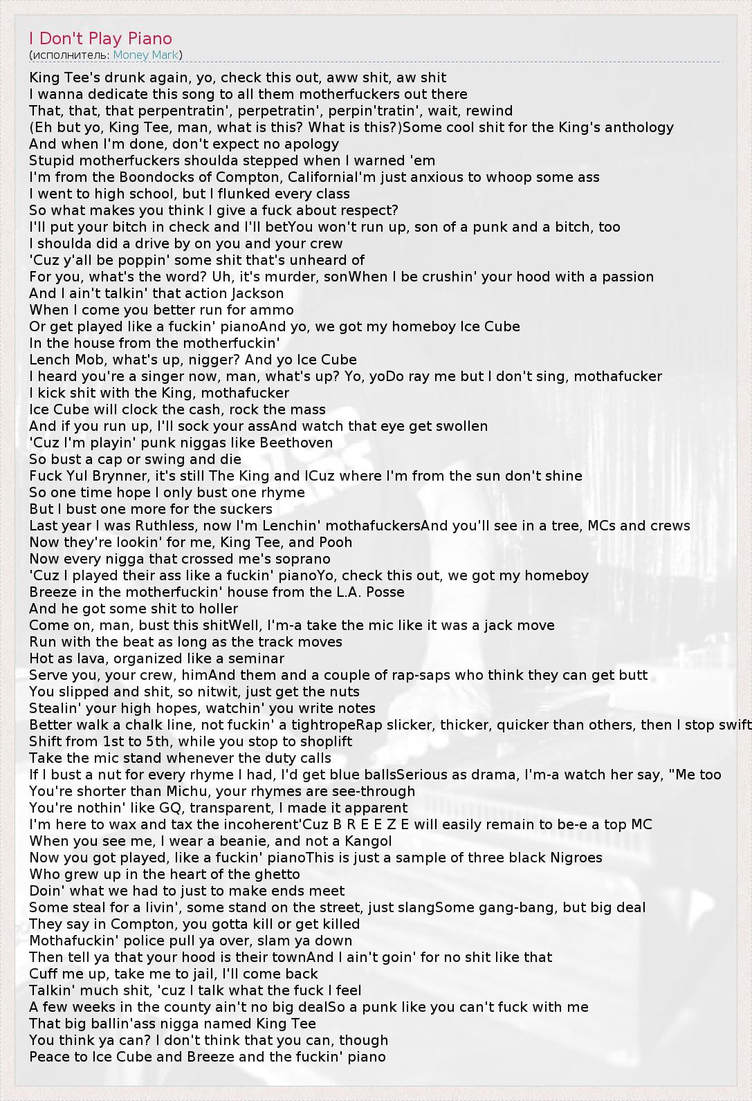 King Tee's drunk again, yo, check this out, aww shit, aw shit I wanna dedicate this song to all them motherfuckers out there That, that, that perpentratin', perpetratin', perpin'tratin', wait, rewind (Eh but yo, King Tee, man, what is this? What is this?)Some cool shit for the King's anthology And when I'm done, don't expect no apology Stupid motherfuckers shoulda stepped when I warned 'em I'm from the Boondocks of Compton, CaliforniaI'm just anxious to whoop some ass I went to high school, but I flunked every class So what makes you think I give a fuck about respect? I'll put your bitch in check and I'll betYou won't run up, son of a punk and a bitch, too I shoulda did a drive by on you and your crew 'Cuz y'all be poppin' some shit that's unheard of For you, what's the word? Uh, it's murder, sonWhen I be crushin' your hood with a passion And I ain't talkin' that action Jackson When I come you better run for ammo Or get played like a fuckin' pianoAnd yo, we got my homeboy Ice Cube In the house from the motherfuckin' Lench Mob, what's up, nigger? And yo Ice Cube I heard you're a singer now, man, what's up? Yo, yoDo ray me but I don't sing, mothafucker I kick shit with the King, mothafucker Ice Cube will clock the cash, rock the mass And if you run up, I'll sock your assAnd watch that eye get swollen 'Cuz I'm playin' punk niggas like Beethoven So bust a cap or swing and die Fuck Yul Brynner, it's still The King and ICuz where I'm from the sun don't shine So one time hope I only bust one rhyme But I bust one more for the suckers Last year I was Ruthless, now I'm Lenchin' mothafuckersAnd you'll see in a tree, MCs and crews Now they're lookin' for me, King Tee, and Pooh Now every nigga that crossed me's soprano 'Cuz I played their ass like a fuckin' pianoYo, check this out, we got my homeboy Breeze in the motherfuckin' house from the L.A. Posse And he got some shit to holler Come on, man, bust this shitWell, I'm-a take the mic like it was a jack move Run with the beat as long as the track moves Hot as lava, organized like a seminar Serve you, your crew, himAnd them and a couple of rap-saps who think they can get butt You slipped and shit, so nitwit, just get the nuts Stealin' your high hopes, watchin' you write notes Better walk a chalk line, not fuckin' a tightropeRap slicker, thicker, quicker than others, then I stop swift Shift from 1st to 5th, while you stop to shoplift Take the mic stand whenever the duty calls If I bust a nut for every rhyme I had, I'd get blue ballsSerious as drama, I'm-a watch her say, "Me too You're shorter than Michu, your rhymes are see-through You're nothin' like GQ, transparent, I made it apparent I'm here to wax and tax the incoherent'Cuz B R E E Z E will easily remain to be-e a top MC When you see me, I wear a beanie, and not a Kangol Now you got played, like a fuckin' pianoThis is just a sample of three black Nigroes Who grew up in the heart of the ghetto Doin' what we had to just to make ends meet Some steal for a livin', some stand on the street, just slangSome gang-bang, but big deal They say in Compton, you gotta kill or get killed Mothafuckin' police pull ya over, slam ya down Then tell ya that your hood is their townAnd I ain't goin' for no shit like that Cuff me up, take me to jail, I'll come back Talkin' much shit, 'cuz I talk what the fuck I feel A few weeks in the county ain't no big dealSo a punk like you can't fuck with me That big ballin'ass nigga named King Tee You think ya can? I don't think that you can, though Peace to Ice Cube and Breeze and the fuckin' piano