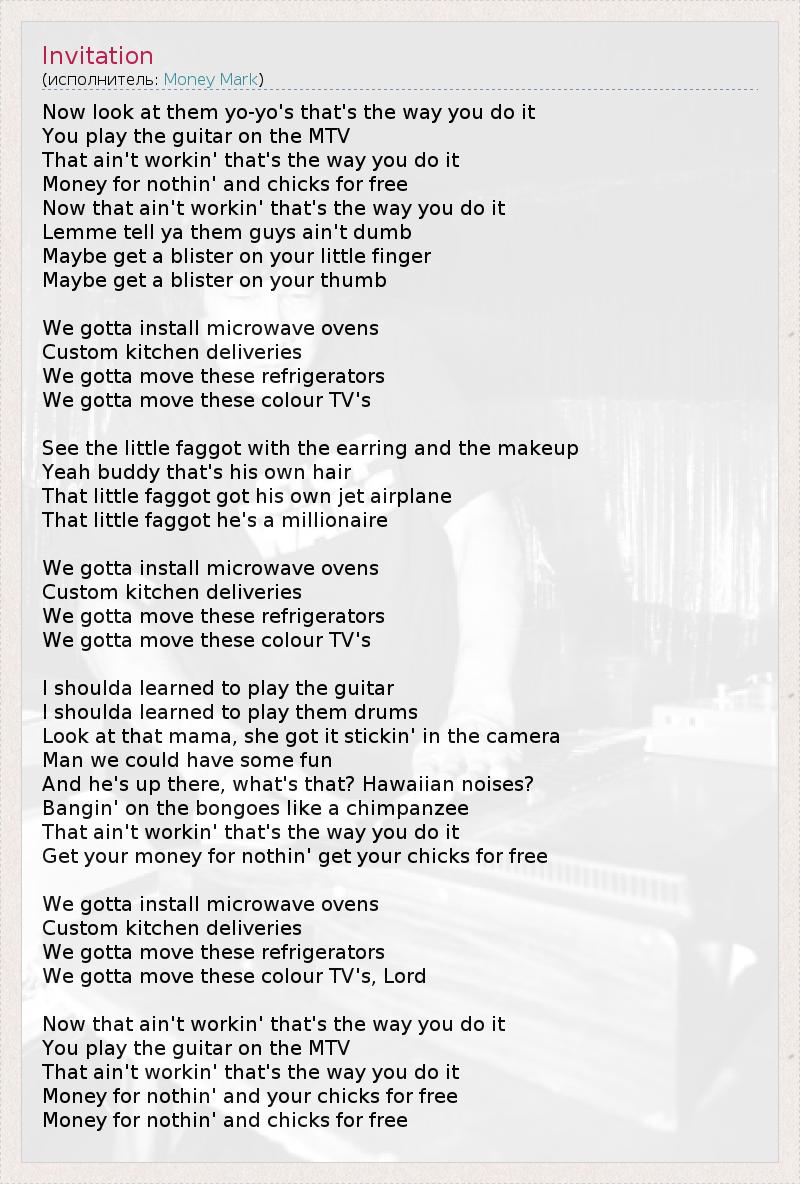 Now look at them yo-yo's that's the way you do it You play the guitar on the MTV That ain't workin' that's the way you do it Money for nothin' and chicks for free Now that ain't workin' that's the way you do it Lemme tell ya them guys ain't dumb Maybe get a blister on your little finger Maybe get a blister on your thumb We gotta install microwave ovens Custom kitchen deliveries We gotta move these refrigerators We gotta move these colour TV's See the little faggot with the earring and the makeup Yeah buddy that's his own hair That little faggot got his own jet airplane That little faggot he's a millionaire We gotta install microwave ovens Custom kitchen deliveries We gotta move these refrigerators We gotta move these colour TV's I shoulda learned to play the guitar I shoulda learned to play them drums Look at that mama, she got it stickin' in the camera Man we could have some fun And he's up there, what's that? Hawaiian noises? Bangin' on the bongoes like a chimpanzee That ain't workin' that's the way you do it Get your money for nothin' get your chicks for free We gotta install microwave ovens Custom kitchen deliveries We gotta move these refrigerators We gotta move these colour TV's, Lord Now that ain't workin' that's the way you do it You play the guitar on the MTV That ain't workin' that's the way you do it Money for nothin' and your chicks for free Money for nothin' and chicks for free