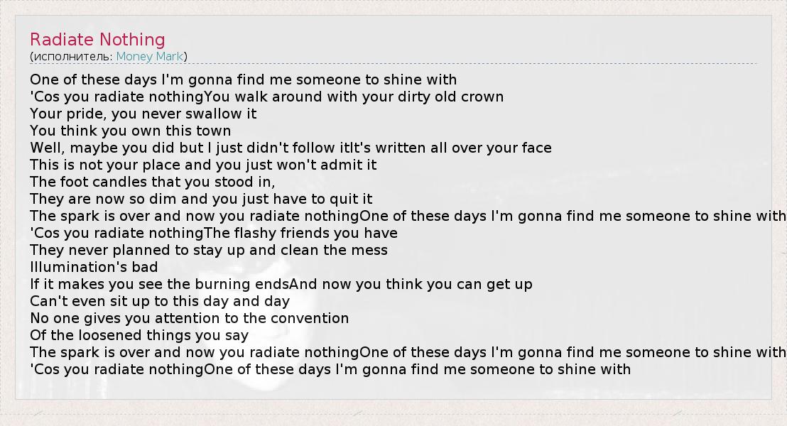 One of these days I'm gonna find me someone to shine with 'Cos you radiate nothingYou walk around with your dirty old crown Your pride, you never swallow it You think you own this town Well, maybe you did but I just didn't follow itIt's written all over your face This is not your place and you just won't admit it The foot candles that you stood in, They are now so dim and you just have to quit it The spark is over and now you radiate nothingOne of these days I'm gonna find me someone to shine with 'Cos you radiate nothingThe flashy friends you have They never planned to stay up and clean the mess Illumination's bad If it makes you see the burning endsAnd now you think you can get up Can't even sit up to this day and day No one gives you attention to the convention Of the loosened things you say The spark is over and now you radiate nothingOne of these days I'm gonna find me someone to shine with 'Cos you radiate nothingOne of these days I'm gonna find me someone to shine with