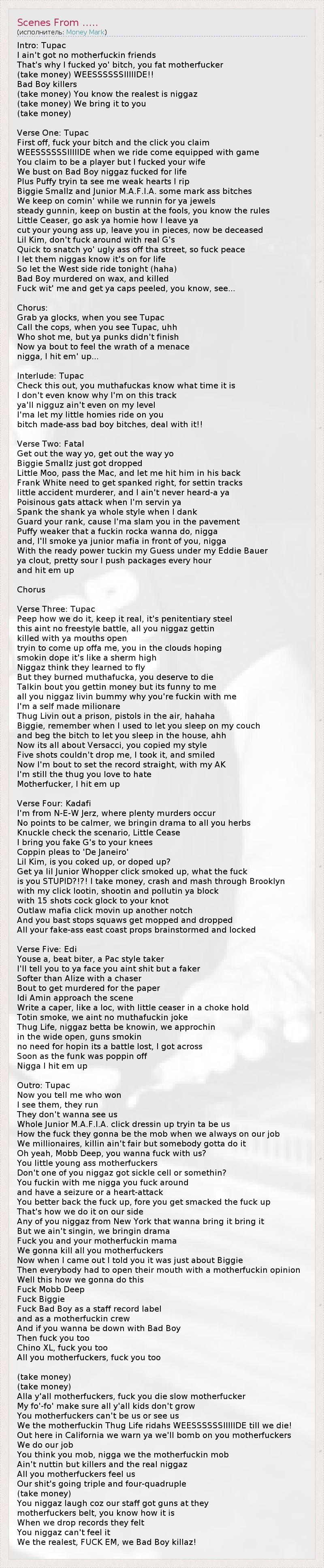 Intro: Tupac I ain't got no motherfuckin friends That's why I fucked yo' bitch, you fat motherfucker (take money) WEESSSSSSIIIIIDE!! Bad Boy killers (take money) You know the realest is niggaz (take money) We bring it to you (take money) Verse One: Tupac First off, fuck your bitch and the click you claim WEESSSSSSIIIIIDE when we ride come equipped with game You claim to be a player but I fucked your wife We bust on Bad Boy niggaz fucked for life Plus Puffy tryin ta see me weak hearts I rip Biggie Smallz and Junior M.A.F.I.A. some mark ass bitches We keep on comin' while we runnin for ya jewels steady gunnin, keep on bustin at the fools, you know the rules Little Ceaser, go ask ya homie how I leave ya cut your young ass up, leave you in pieces, now be deceased Lil Kim, don't fuck around with real G's Quick to snatch yo' ugly ass off tha street, so fuck peace I let them niggas know it's on for life So let the West side ride tonight (haha) Bad Boy murdered on wax, and killed Fuck wit' me and get ya caps peeled, you know, see... Chorus: Grab ya glocks, when you see Tupac Call the cops, when you see Tupac, uhh Who shot me, but ya punks didn't finish Now ya bout to feel the wrath of a menace nigga, I hit em' up... Interlude: Tupac Check this out, you muthafuckas know what time it is I don't even know why I'm on this track ya'll nigguz ain't even on my level I'ma let my little homies ride on you bitch made-ass bad boy bitches, deal with it!! Verse Two: Fatal Get out the way yo, get out the way yo Biggie Smallz just got dropped Little Moo, pass the Mac, and let me hit him in his back Frank White need to get spanked right, for settin tracks little accident murderer, and I ain't never heard-a ya Poisinous gats attack when I'm servin ya Spank the shank ya whole style when I dank Guard your rank, cause I'ma slam you in the pavement Puffy weaker that a fuckin rocka wanna do, nigga and, I'll smoke ya junior mafia in front of you, nigga With the ready power tuckin my Guess under my Eddie Bauer ya clout, pretty sour I push packages every hour and hit em up Chorus Verse Three: Tupac Peep how we do it, keep it real, it's penitentiary steel this aint no freestyle battle, all you niggaz gettin killed with ya mouths open tryin to come up offa me, you in the clouds hoping smokin dope it's like a sherm high Niggaz think they learned to fly But they burned muthafucka, you deserve to die Talkin bout you gettin money but its funny to me all you niggaz livin bummy why you're fuckin with me I'm a self made milionare Thug Livin out a prison, pistols in the air, hahaha Biggie, remember when I used to let you sleep on my couch and beg the bitch to let you sleep in the house, ahh Now its all about Versacci, you copied my style Five shots couldn't drop me, I took it, and smiled Now I'm bout to set the record straight, with my AK I'm still the thug you love to hate Motherfucker, I hit em up Verse Four: Kadafi I'm from N-E-W Jerz, where plenty murders occur No points to be calmer, we bringin drama to all you herbs Knuckle check the scenario, Little Cease I bring you fake G's to your knees Coppin pleas to 'De Janeiro' Lil Kim, is you coked up, or doped up? Get ya lil Junior Whopper click smoked up, what the fuck is you STUPID?!?! I take money, crash and mash through Brooklyn with my click lootin, shootin and pollutin ya block with 15 shots cock glock to your knot Outlaw mafia click movin up another notch And you bast stops squaws get mopped and dropped All your fake-ass east coast props brainstormed and locked Verse Five: Edi Youse a, beat biter, a Pac style taker I'll tell you to ya face you aint shit but a faker Softer than Alize with a chaser Bout to get murdered for the paper Idi Amin approach the scene Write a caper, like a loc, with little ceaser in a choke hold Totin smoke, we aint no muthafuckin joke Thug Life, niggaz betta be knowin, we approchin in the wide open, guns smokin no need for hopin its a battle lost, I got across Soon as the funk was poppin off Nigga I hit em up Outro: Tupac Now you tell me who won I see them, they run They don't wanna see us Whole Junior M.A.F.I.A. click dressin up tryin ta be us How the fuck they gonna be the mob when we always on our job We millionaires, killin ain't fair but somebody gotta do it Oh yeah, Mobb Deep, you wanna fuck with us? You little young ass motherfuckers Don't one of you niggaz got sickle cell or somethin? You fuckin with me nigga you fuck around and have a seizure or a heart-attack You better back the fuck up, fore you get smacked the fuck up That's how we do it on our side Any of you niggaz from New York that wanna bring it bring it But we ain't singin, we bringin drama Fuck you and your motherfuckin mama We gonna kill all you motherfuckers Now when I came out I told you it was just about Biggie Then everybody had to open their mouth with a motherfuckin opinion Well this how we gonna do this Fuck Mobb Deep Fuck Biggie Fuck Bad Boy as a staff record label and as a motherfuckin crew And if you wanna be down with Bad Boy Then fuck you too Chino XL, fuck you too All you motherfuckers, fuck you too (take money) (take money) Alla y'all motherfuckers, fuck you die slow motherfucker My fo'-fo' make sure all y'all kids don't grow You motherfuckers can't be us or see us We the motherfuckin Thug Life ridahs WEESSSSSSIIIIIDE till we die! Out here in California we warn ya we'll bomb on you motherfuckers We do our job You think you mob, nigga we the motherfuckin mob Ain't nuttin but killers and the real niggaz All you motherfuckers feel us Our shit's going triple and four-quadruple (take money) You niggaz laugh coz our staff got guns at they motherfuckers belt, you know how it is When we drop records they felt You niggaz can't feel it We the realest, FUCK EM, we Bad Boy killaz!