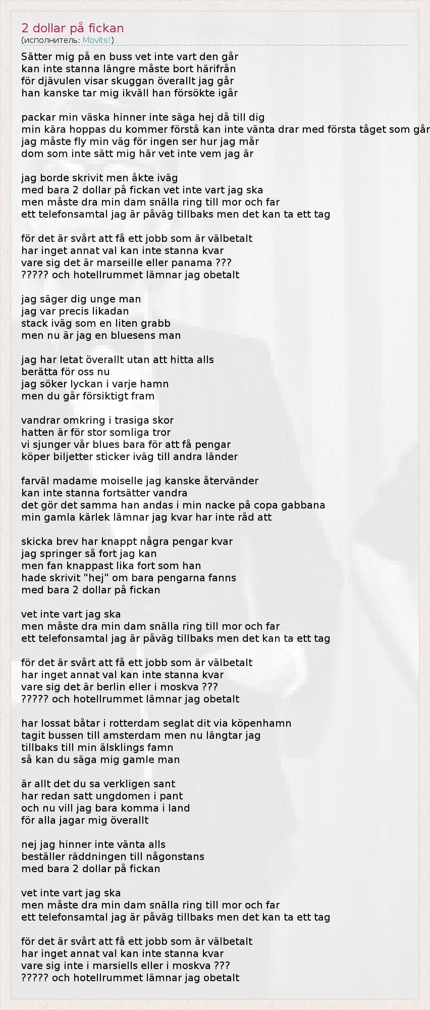 Sätter mig på en buss vet inte vart den går kan inte stanna längre måste bort härifrån för djävulen visar skuggan överallt jag går han kanske tar mig ikväll han försökte igår packar min väska hinner inte säga hej då till dig min kära hoppas du kommer förstå kan inte vänta drar med första tåget som går jag måste fly min väg för ingen ser hur jag mår dom som inte sätt mig här vet inte vem jag är jag borde skrivit men åkte iväg med bara 2 dollar på fickan vet inte vart jag ska men måste dra min dam snälla ring till mor och far ett telefonsamtal jag är påväg tillbaks men det kan ta ett tag för det är svårt att få ett jobb som är välbetalt har inget annat val kan inte stanna kvar vare sig det är marseille eller panama ??? ????? och hotellrummet lämnar jag obetalt jag säger dig unge man jag var precis likadan stack iväg som en liten grabb men nu är jag en bluesens man jag har letat överallt utan att hitta alls berätta för oss nu jag söker lyckan i varje hamn men du går försiktigt fram vandrar omkring i trasiga skor hatten är för stor somliga tror vi sjunger vår blues bara för att få pengar köper biljetter sticker iväg till andra länder farväl madame moiselle jag kanske återvänder kan inte stanna fortsätter vandra det gör det samma han andas i min nacke på copa gabbana min gamla kärlek lämnar jag kvar har inte råd att skicka brev har knappt några pengar kvar jag springer så fort jag kan men fan knappast lika fort som han hade skrivit "hej" om bara pengarna fanns med bara 2 dollar på fickan vet inte vart jag ska men måste dra min dam snälla ring till mor och far ett telefonsamtal jag är påväg tillbaks men det kan ta ett tag för det är svårt att få ett jobb som är välbetalt har inget annat val kan inte stanna kvar vare sig det är berlin eller i moskva ??? ????? och hotellrummet lämnar jag obetalt har lossat båtar i rotterdam seglat dit via köpenhamn tagit bussen till amsterdam men nu längtar jag tillbaks till min älsklings famn så kan du säga mig gamle man är allt det du sa verkligen sant har redan satt ungdomen i pant och nu vill jag bara komma i land för alla jagar mig överallt nej jag hinner inte vänta alls beställer räddningen till någonstans med bara 2 dollar på fickan vet inte vart jag ska men måste dra min dam snälla ring till mor och far ett telefonsamtal jag är påväg tillbaks men det kan ta ett tag för det är svårt att få ett jobb som är välbetalt har inget annat val kan inte stanna kvar vare sig inte i marsiells eller i moskva ??? ????? och hotellrummet lämnar jag obetalt