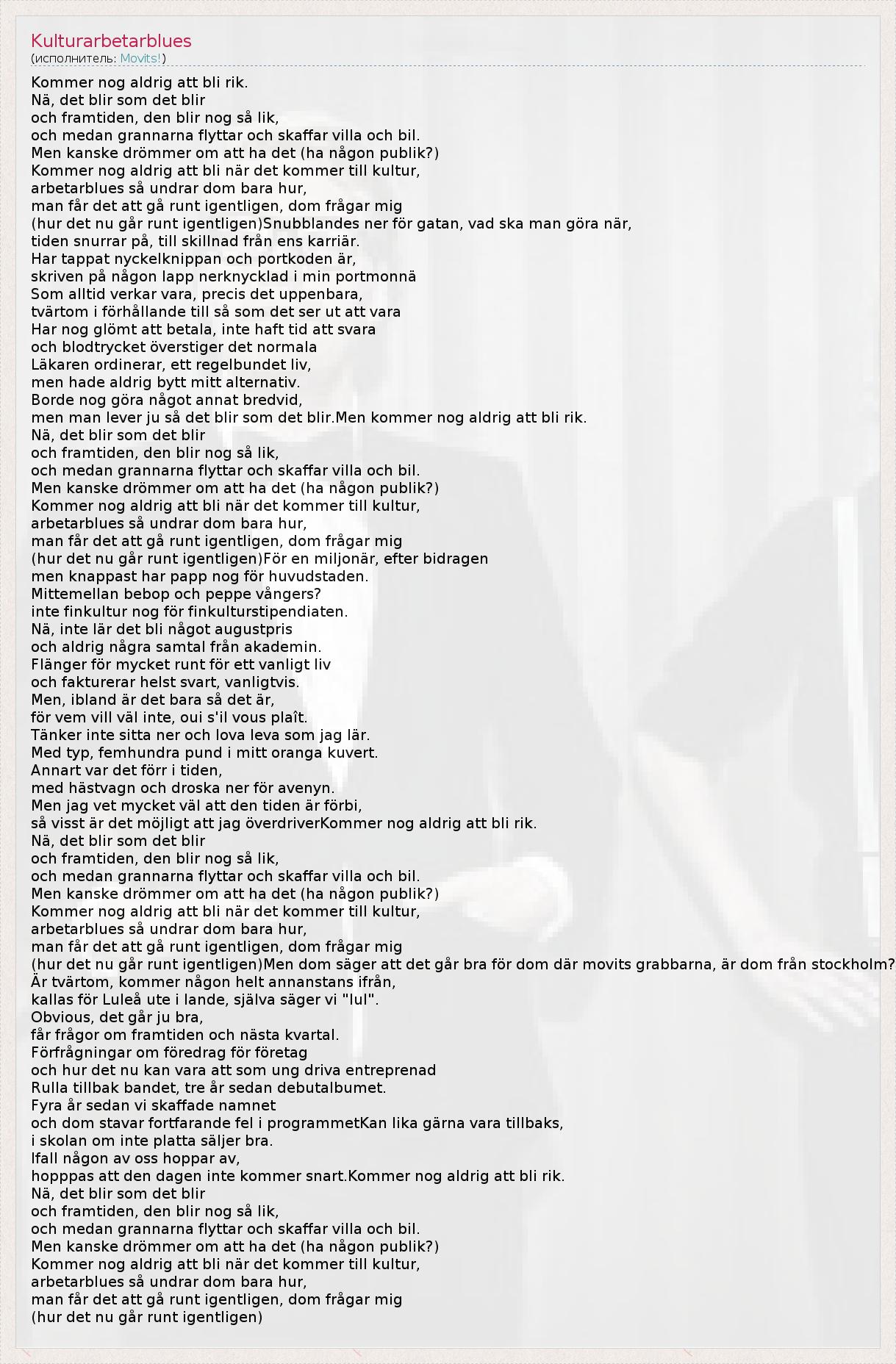 Kommer nog aldrig att bli rik. Nä, det blir som det blir och framtiden, den blir nog så lik, och medan grannarna flyttar och skaffar villa och bil. Men kanske drömmer om att ha det (ha någon publik?) Kommer nog aldrig att bli när det kommer till kultur, arbetarblues så undrar dom bara hur, man får det att gå runt igentligen, dom frågar mig (hur det nu går runt igentligen)Snubblandes ner för gatan, vad ska man göra när, tiden snurrar på, till skillnad från ens karriär. Har tappat nyckelknippan och portkoden är, skriven på någon lapp nerknycklad i min portmonnä Som alltid verkar vara, precis det uppenbara, tvärtom i förhållande till så som det ser ut att vara Har nog glömt att betala, inte haft tid att svara och blodtrycket överstiger det normala Läkaren ordinerar, ett regelbundet liv, men hade aldrig bytt mitt alternativ. Borde nog göra något annat bredvid, men man lever ju så det blir som det blir.Men kommer nog aldrig att bli rik. Nä, det blir som det blir och framtiden, den blir nog så lik, och medan grannarna flyttar och skaffar villa och bil. Men kanske drömmer om att ha det (ha någon publik?) Kommer nog aldrig att bli när det kommer till kultur, arbetarblues så undrar dom bara hur, man får det att gå runt igentligen, dom frågar mig (hur det nu går runt igentligen)För en miljonär, efter bidragen men knappast har papp nog för huvudstaden. Mittemellan bebop och peppe vångers? inte finkultur nog för finkulturstipendiaten. Nä, inte lär det bli något augustpris och aldrig några samtal från akademin. Flänger för mycket runt för ett vanligt liv och fakturerar helst svart, vanligtvis. Men, ibland är det bara så det är, för vem vill väl inte, oui s'il vous plaît. Tänker inte sitta ner och lova leva som jag lär. Med typ, femhundra pund i mitt oranga kuvert. Annart var det förr i tiden, med hästvagn och droska ner för avenyn. Men jag vet mycket väl att den tiden är förbi, så visst är det möjligt att jag överdriverKommer nog aldrig att bli rik. Nä, det blir som det blir och framtiden, den blir nog så lik, och medan grannarna flyttar och skaffar villa och bil. Men kanske drömmer om att ha det (ha någon publik?) Kommer nog aldrig att bli när det kommer till kultur, arbetarblues så undrar dom bara hur, man får det att gå runt igentligen, dom frågar mig (hur det nu går runt igentligen)Men dom säger att det går bra för dom där movits grabbarna, är dom från stockholm? Är tvärtom, kommer någon helt annanstans ifrån, kallas för Luleå ute i lande, själva säger vi "lul". Obvious, det går ju bra, får frågor om framtiden och nästa kvartal. Förfrågningar om föredrag för företag och hur det nu kan vara att som ung driva entreprenad Rulla tillbak bandet, tre år sedan debutalbumet. Fyra år sedan vi skaffade namnet och dom stavar fortfarande fel i programmetKan lika gärna vara tillbaks, i skolan om inte platta säljer bra. Ifall någon av oss hoppar av, hopppas att den dagen inte kommer snart.Kommer nog aldrig att bli rik. Nä, det blir som det blir och framtiden, den blir nog så lik, och medan grannarna flyttar och skaffar villa och bil. Men kanske drömmer om att ha det (ha någon publik?) Kommer nog aldrig att bli när det kommer till kultur, arbetarblues så undrar dom bara hur, man får det att gå runt igentligen, dom frågar mig (hur det nu går runt igentligen)