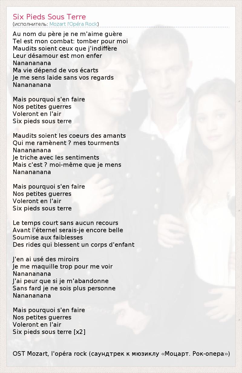 Au nom du père je ne m'aime guère Tel est mon combat: tomber pour moi Maudits soient ceux que j'indiffère Leur désamour est mon enfer Nanananana Ma vie dépend de vos écarts Je me sens laide sans vos regards Nanananana Mais pourquoi s'en faire Nos petites guerres Voleront en l'air Six pieds sous terre Maudits soient les coeurs des amants Qui me ramènent ? mes tourments Nanananana Je triche avec les sentiments Mais c'est ? moi-même que je mens Nanananana Mais pourquoi s'en faire Nos petites guerres Voleront en l'air Six pieds sous terre Le temps court sans aucun recours Avant l'éternel serais-je encore belle Soumise aux faiblesses Des rides qui blessent un corps d'enfant J'en ai usé des miroirs Je me maquille trop pour me voir Nanananana J'ai peur que si je m'abandonne Sans fard je ne sois plus personne Nanananana Mais pourquoi s'en faire Nos petites guerres Voleront en l'air Six pieds sous terre [x2] OST Mozart, l'opéra rock (саундтрек к мюзиклу «Моцарт. Рок-опера»)