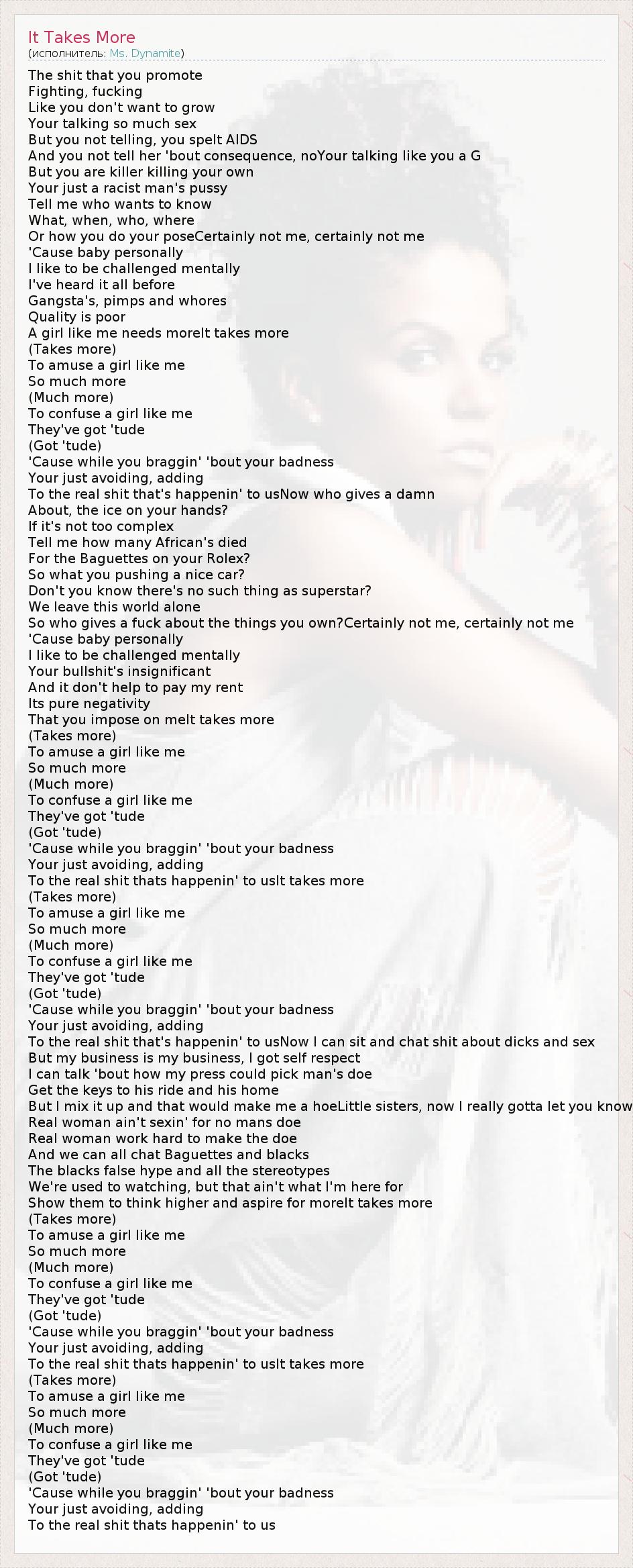 The shit that you promote Fighting, fucking Like you don't want to grow Your talking so much sex But you not telling, you spelt AIDS And you not tell her 'bout consequence, noYour talking like you a G But you are killer killing your own Your just a racist man's pussy Tell me who wants to know What, when, who, where Or how you do your poseCertainly not me, certainly not me 'Cause baby personally I like to be challenged mentally I've heard it all before Gangsta's, pimps and whores Quality is poor A girl like me needs moreIt takes more (Takes more) To amuse a girl like me So much more (Much more) To confuse a girl like me They've got 'tude (Got 'tude) 'Cause while you braggin' 'bout your badness Your just avoiding, adding To the real shit that's happenin' to usNow who gives a damn About, the ice on your hands? If it's not too complex Tell me how many African's died For the Baguettes on your Rolex? So what you pushing a nice car? Don't you know there's no such thing as superstar? We leave this world alone So who gives a fuck about the things you own?Certainly not me, certainly not me 'Cause baby personally I like to be challenged mentally Your bullshit's insignificant And it don't help to pay my rent Its pure negativity That you impose on meIt takes more (Takes more) To amuse a girl like me So much more (Much more) To confuse a girl like me They've got 'tude (Got 'tude) 'Cause while you braggin' 'bout your badness Your just avoiding, adding To the real shit thats happenin' to usIt takes more (Takes more) To amuse a girl like me So much more (Much more) To confuse a girl like me They've got 'tude (Got 'tude) 'Cause while you braggin' 'bout your badness Your just avoiding, adding To the real shit that's happenin' to usNow I can sit and chat shit about dicks and sex But my business is my business, I got self respect I can talk 'bout how my press could pick man's doe Get the keys to his ride and his home But I mix it up and that would make me a hoeLittle sisters, now I really gotta let you know Real woman ain't sexin' for no mans doe Real woman work hard to make the doe And we can all chat Baguettes and blacks The blacks false hype and all the stereotypes We're used to watching, but that ain't what I'm here for Show them to think higher and aspire for moreIt takes more (Takes more) To amuse a girl like me So much more (Much more) To confuse a girl like me They've got 'tude (Got 'tude) 'Cause while you braggin' 'bout your badness Your just avoiding, adding To the real shit thats happenin' to usIt takes more (Takes more) To amuse a girl like me So much more (Much more) To confuse a girl like me They've got 'tude (Got 'tude) 'Cause while you braggin' 'bout your badness Your just avoiding, adding To the real shit thats happenin' to us