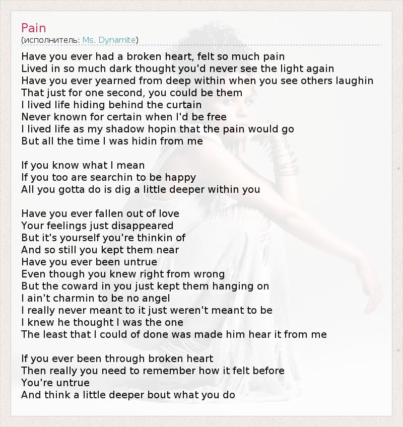 Have you ever had a broken heart, felt so much pain Lived in so much dark thought you'd never see the light again Have you ever yearned from deep within when you see others laughin That just for one second, you could be them I lived life hiding behind the curtain Never known for certain when I'd be free I lived life as my shadow hopin that the pain would go But all the time I was hidin from me If you know what I mean If you too are searchin to be happy All you gotta do is dig a little deeper within you Have you ever fallen out of love Your feelings just disappeared But it's yourself you're thinkin of And so still you kept them near Have you ever been untrue Even though you knew right from wrong But the coward in you just kept them hanging on I ain't charmin to be no angel I really never meant to it just weren't meant to be I knew he thought I was the one The least that I could of done was made him hear it from me If you ever been through broken heart Then really you need to remember how it felt before You're untrue And think a little deeper bout what you do