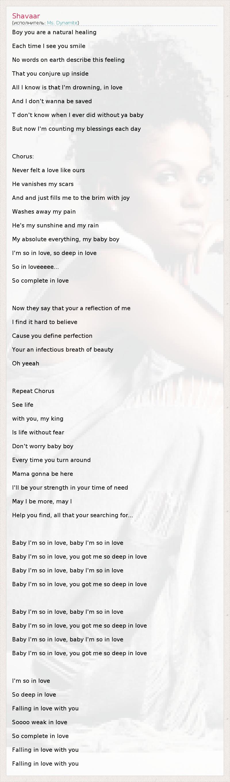 Boy you are a natural healing Each time I see you smile No words on earth describe this feeling That you conjure up inside All I know is that I'm drowning, in love And I don't wanna be saved T don't know when I ever did without ya baby But now I'm counting my blessings each day Chorus: Never felt a love like ours He vanishes my scars And and just fills me to the brim with joy Washes away my pain He's my sunshine and my rain My absolute everything, my baby boy I'm so in love, so deep in love So in loveeeee... So complete in love Now they say that your a reflection of me I find it hard to believe Cause you define perfection Your an infectious breath of beauty Oh yeeah Repeat Chorus See life with you, my king Is life without fear Don't worry baby boy Every time you turn around Mama gonna be here I'll be your strength in your time of need May I be more, may I Help you find, all that your searching for... Baby I'm so in love, baby I'm so in love Baby I'm so in love, you got me so deep in love Baby I'm so in love, baby I'm so in love Baby I'm so in love, you got me so deep in love Baby I'm so in love, baby I'm so in love Baby I'm so in love, you got me so deep in love Baby I'm so in love, baby I'm so in love Baby I'm so in love, you got me so deep in love I'm so in love So deep in love Falling in love with you Soooo weak in love So complete in love Falling in love with you Falling in love with you