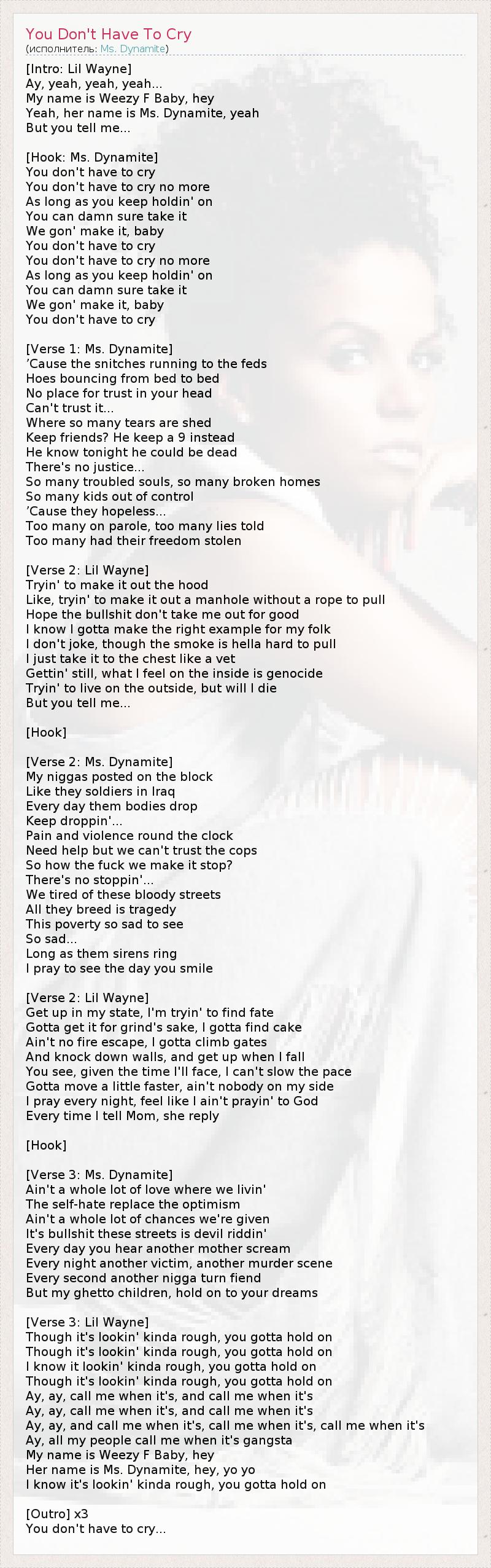 [Intro: Lil Wayne] Ay, yeah, yeah, yeah... My name is Weezy F Baby, hey Yeah, her name is Ms. Dynamite, yeah But you tell me... [Hook: Ms. Dynamite] You don't have to cry You don't have to cry no more As long as you keep holdin' on You can damn sure take it We gon' make it, baby You don't have to cry You don't have to cry no more As long as you keep holdin' on You can damn sure take it We gon' make it, baby You don't have to cry [Verse 1: Ms. Dynamite] ’Cause the snitches running to the feds Hoes bouncing from bed to bed No place for trust in your head Can't trust it... Where so many tears are shed Keep friends? He keep a 9 instead He know tonight he could be dead There's no justice... So many troubled souls, so many broken homes So many kids out of control ’Cause they hopeless... Too many on parole, too many lies told Too many had their freedom stolen [Verse 2: Lil Wayne] Tryin' to make it out the hood Like, tryin' to make it out a manhole without a rope to pull Hope the bullshit don't take me out for good I know I gotta make the right example for my folk I don't joke, though the smoke is hella hard to pull I just take it to the chest like a vet Gettin' still, what I feel on the inside is genocide Tryin' to live on the outside, but will I die But you tell me... [Hook] [Verse 2: Ms. Dynamite] My niggas posted on the block Like they soldiers in Iraq Every day them bodies drop Keep droppin'... Pain and violence round the clock Need help but we can't trust the cops So how the fuck we make it stop? There's no stoppin'... We tired of these bloody streets All they breed is tragedy This poverty so sad to see So sad... Long as them sirens ring I pray to see the day you smile [Verse 2: Lil Wayne] Get up in my state, I'm tryin' to find fate Gotta get it for grind's sake, I gotta find cake Ain't no fire escape, I gotta climb gates And knock down walls, and get up when I fall You see, given the time I'll face, I can't slow the pace Gotta move a little faster, ain't nobody on my side I pray every night, feel like I ain't prayin' to God Every time I tell Mom, she reply [Hook] [Verse 3: Ms. Dynamite] Ain't a whole lot of love where we livin' The self-hate replace the optimism Ain't a whole lot of chances we're given It's bullshit these streets is devil riddin' Every day you hear another mother scream Every night another victim, another murder scene Every second another nigga turn fiend But my ghetto children, hold on to your dreams [Verse 3: Lil Wayne] Though it's lookin' kinda rough, you gotta hold on Though it's lookin' kinda rough, you gotta hold on I know it lookin' kinda rough, you gotta hold on Though it's lookin' kinda rough, you gotta hold on Ay, ay, call me when it's, and call me when it's Ay, ay, call me when it's, and call me when it's Ay, ay, and call me when it's, call me when it's, call me when it's Ay, all my people call me when it's gangsta My name is Weezy F Baby, hey Her name is Ms. Dynamite, hey, yo yo I know it's lookin' kinda rough, you gotta hold on [Outro] x3 You don't have to cry...