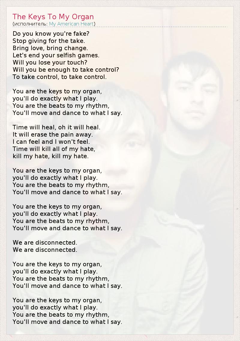 Do you know you're fake? Stop giving for the take. Bring love, bring change. Let's end your selfish games. Will you lose your touch? Will you be enough to take control? To take control, to take control. You are the keys to my organ, you'll do exactly what I play. You are the beats to my rhythm, You'll move and dance to what I say. Time will heal, oh it will heal. It will erase the pain away. I can feel and I won't feel. Time will kill all of my hate, kill my hate, kill my hate. You are the keys to my organ, you'll do exactly what I play. You are the beats to my rhythm, You'll move and dance to what I say. You are the keys to my organ, you'll do exactly what I play. You are the beats to my rhythm, You'll move and dance to what I say. We are disconnected. We are disconnected. You are the keys to my organ, you'll do exactly what I play. You are the beats to my rhythm, You'll move and dance to what I say. You are the keys to my organ, you'll do exactly what I play. You are the beats to my rhythm, You'll move and dance to what I say.