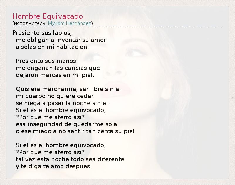 Presiento sus labios, me obligan a inventar su amor a solas en mi habitacion. Presiento sus manos me enganan las caricias que dejaron marcas en mi piel. Quisiera marcharme, ser libre sin el mi cuerpo no quiere ceder se niega a pasar la noche sin el. Si el es el hombre equivocado, ?Por que me aferro asi? esa inseguridad de quedarme sola o ese miedo a no sentir tan cerca su piel Si el es el hombre equivocado, ?Por que me aferro asi? tal vez esta noche todo sea diferente y te diga te amo despues