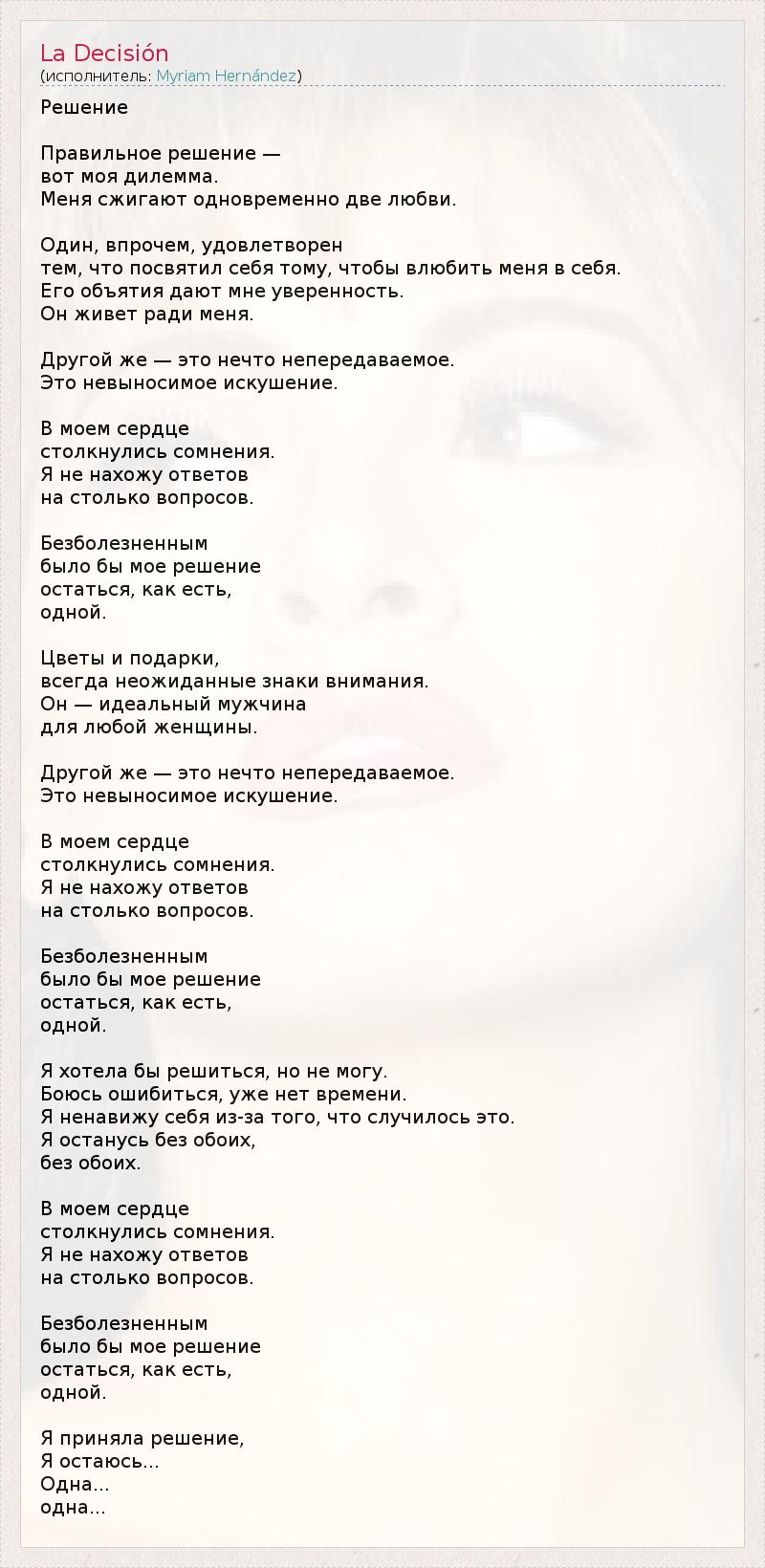 Решение Правильное решение — вот моя дилемма. Меня сжигают одновременно две любви. Один, впрочем, удовлетворен тем, что посвятил себя тому, чтобы влюбить меня в себя. Его объятия дают мне уверенность. Он живет ради меня. Другой же — это нечто непередаваемое. Это невыносимое искушение. В моем сердце столкнулись сомнения. Я не нахожу ответов на столько вопросов. Безболезненным было бы мое решение остаться, как есть, одной. Цветы и подарки, всегда неожиданные знаки внимания. Он — идеальный мужчина для любой женщины. Другой же — это нечто непередаваемое. Это невыносимое искушение. В моем сердце столкнулись сомнения. Я не нахожу ответов на столько вопросов. Безболезненным было бы мое решение остаться, как есть, одной. Я хотела бы решиться, но не могу. Боюсь ошибиться, уже нет времени. Я ненавижу себя из-за того, что случилось это. Я останусь без обоих, без обоих. В моем сердце столкнулись сомнения. Я не нахожу ответов на столько вопросов. Безболезненным было бы мое решение остаться, как есть, одной. Я приняла решение, Я остаюсь... Одна... одна...