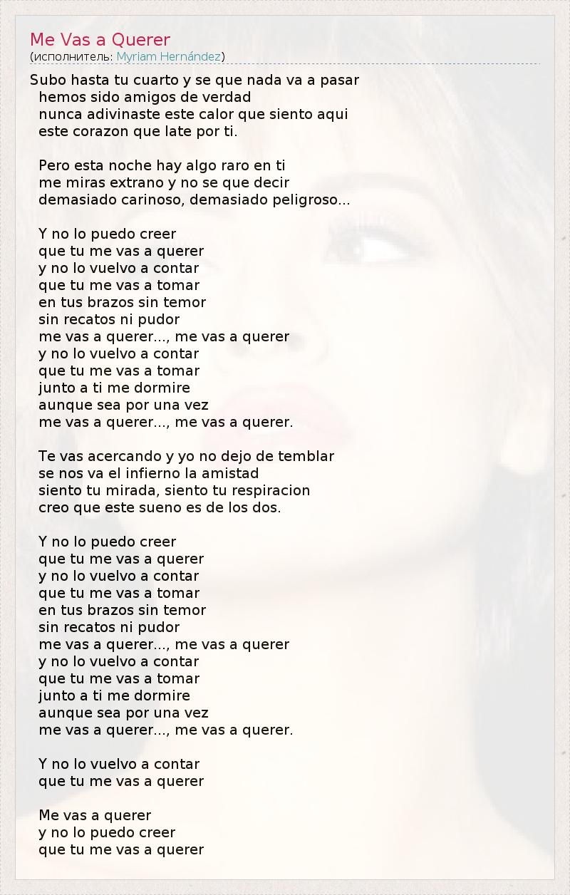 Subo hasta tu cuarto y se que nada va a pasar hemos sido amigos de verdad nunca adivinaste este calor que siento aqui este corazon que late por ti. Pero esta noche hay algo raro en ti me miras extrano y no se que decir demasiado carinoso, demasiado peligroso... Y no lo puedo creer que tu me vas a querer y no lo vuelvo a contar que tu me vas a tomar en tus brazos sin temor sin recatos ni pudor me vas a querer..., me vas a querer y no lo vuelvo a contar que tu me vas a tomar junto a ti me dormire aunque sea por una vez me vas a querer..., me vas a querer. Te vas acercando y yo no dejo de temblar se nos va el infierno la amistad siento tu mirada, siento tu respiracion creo que este sueno es de los dos. Y no lo puedo creer que tu me vas a querer y no lo vuelvo a contar que tu me vas a tomar en tus brazos sin temor sin recatos ni pudor me vas a querer..., me vas a querer y no lo vuelvo a contar que tu me vas a tomar junto a ti me dormire aunque sea por una vez me vas a querer..., me vas a querer. Y no lo vuelvo a contar que tu me vas a querer Me vas a querer y no lo puedo creer que tu me vas a querer