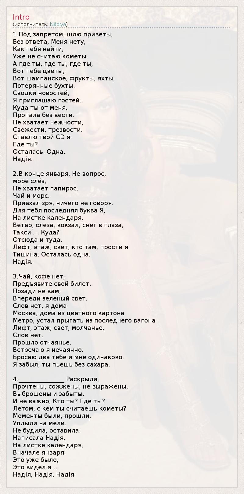 1.Под запретом, шлю приветы, Без ответа, Меня нету, Как тебя найти, Уже не считаю кометы. А где ты, где ты, где ты, Вот тебе цветы, Вот шампанское, фрукты, яхты, Потерянные бухты. Сводки новостей, Я приглашаю гостей. Куда ты от меня, Пропала без вести. Не хватает нежности, Свежести, трезвости. Ставлю твой CD я. Где ты? Осталась. Одна. Надiя. 2.В конце января, Не вопрос, море слёз, Не хватает папирос. Чай и морс. Приехал зря, ничего не говоря. Для тебя последняя буква Я, На листке календаря, Ветер, слеза, вокзал, снег в глаза, Такси.… Куда? Отсюда и туда. Лифт, этаж, свет, кто там, прости я. Тишина. Осталась одна. Надiя. 3.Чай, кофе нет, Предъявите свой билет. Позади не вам, Впереди зеленый свет. Слов нет, я дома Москва, дома из цветного картона Метро, устал прыгать из последнего вагона Лифт, этаж, свет, молчанье, Слов нет. Прошло отчаянье. Встречаю я нечаянно. Бросаю два тебе и мне одинаково. Я забыл, ты пьешь без сахара. 4._______________ Раскрыли, Прочтены, сожжены, не выражены, Выброшены и забыты. И не важно, Кто ты? Где ты? Летом, с кем ты считаешь кометы? Моменты были, прошли, Уплыли на мели. Не будила, оставила. Написала Надiя, На листке календаря, Вначале января. Это уже было, Это видел я… Надiя, Надiя, Надiя