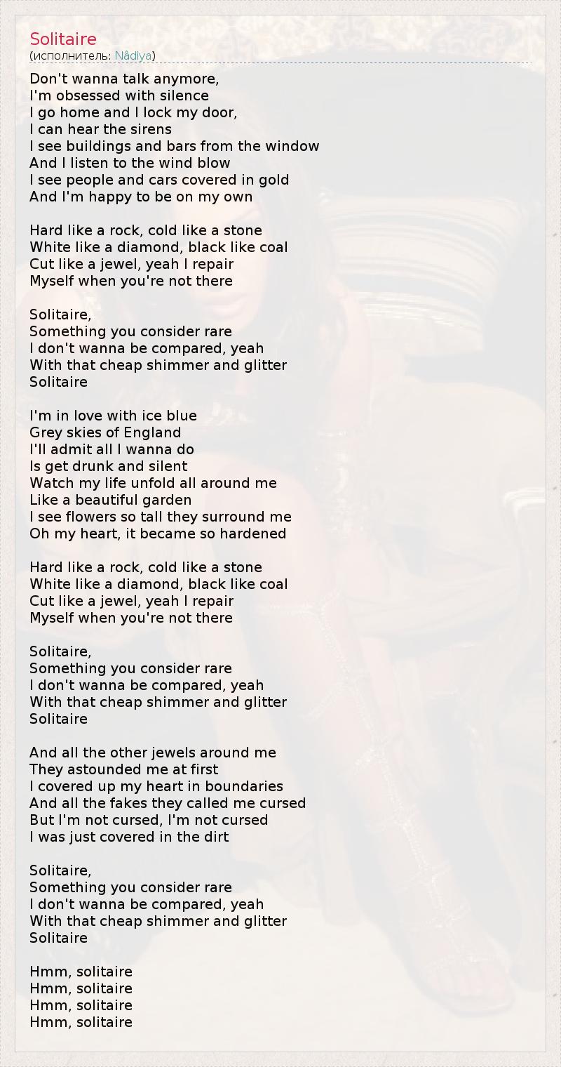 Don't wanna talk anymore, I'm obsessed with silence I go home and I lock my door, I can hear the sirens I see buildings and bars from the window And I listen to the wind blow I see people and cars covered in gold And I'm happy to be on my own Hard like a rock, cold like a stone White like a diamond, black like coal Cut like a jewel, yeah I repair Myself when you're not there Solitaire, Something you consider rare I don't wanna be compared, yeah With that cheap shimmer and glitter Solitaire I'm in love with ice blue Grey skies of England I'll admit all I wanna do Is get drunk and silent Watch my life unfold all around me Like a beautiful garden I see flowers so tall they surround me Oh my heart, it became so hardened Hard like a rock, cold like a stone White like a diamond, black like coal Cut like a jewel, yeah I repair Myself when you're not there Solitaire, Something you consider rare I don't wanna be compared, yeah With that cheap shimmer and glitter Solitaire And all the other jewels around me They astounded me at first I covered up my heart in boundaries And all the fakes they called me cursed But I'm not cursed, I'm not cursed I was just covered in the dirt Solitaire, Something you consider rare I don't wanna be compared, yeah With that cheap shimmer and glitter Solitaire Hmm, solitaire Hmm, solitaire Hmm, solitaire Hmm, solitaire