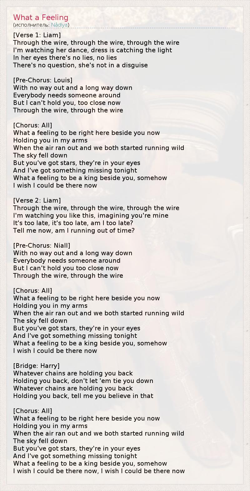 [Verse 1: Liam] Through the wire, through the wire, through the wire I'm watching her dance, dress is catching the light In her eyes there's no lies, no lies There's no question, she's not in a disguise [Pre-Chorus: Louis] With no way out and a long way down Everybody needs someone around But I can't hold you, too close now Through the wire, through the wire [Chorus: All] What a feeling to be right here beside you now Holding you in my arms When the air ran out and we both started running wild The sky fell down But you've got stars, they're in your eyes And I've got something missing tonight What a feeling to be a king beside you, somehow I wish I could be there now [Verse 2: Liam] Through the wire, through the wire, through the wire I'm watching you like this, imagining you're mine It's too late, it's too late, am I too late? Tell me now, am I running out of time? [Pre-Chorus: Niall] With no way out and a long way down Everybody needs someone around But I can't hold you too close now Through the wire, through the wire [Chorus: All] What a feeling to be right here beside you now Holding you in my arms When the air ran out and we both started running wild The sky fell down But you've got stars, they're in your eyes And I've got something missing tonight What a feeling to be a king beside you, somehow I wish I could be there now [Bridge: Harry] Whatever chains are holding you back Holding you back, don't let 'em tie you down Whatever chains are holding you back Holding you back, tell me you believe in that [Chorus: All] What a feeling to be right here beside you now Holding you in my arms When the air ran out and we both started running wild The sky fell down But you've got stars, they're in your eyes And I've got something missing tonight What a feeling to be a king beside you, somehow I wish I could be there now, I wish I could be there now