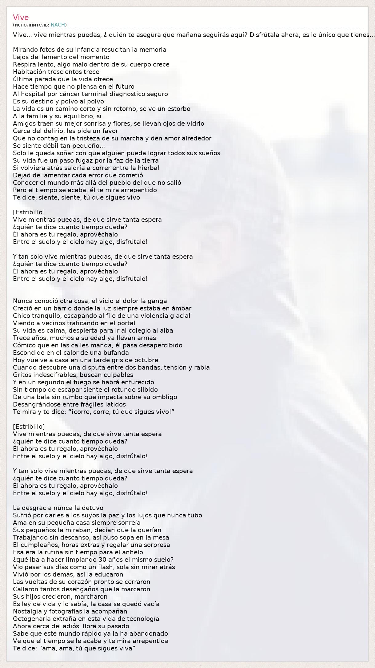 Vive... vive mientras puedas, ¿ quién te asegura que mañana seguirás aquí? Disfrútala ahora, es lo único que tienes... Mirando fotos de su infancia resucitan la memoria Lejos del lamento del momento Respira lento, algo malo dentro de su cuerpo crece Habitación trescientos trece última parada que la vida ofrece Hace tiempo que no piensa en el futuro Al hospital por cáncer terminal diagnostico seguro Es su destino y polvo al polvo La vida es un camino corto y sin retorno, se ve un estorbo A la familia y su equilibrio, si Amigos traen su mejor sonrisa y flores, se llevan ojos de vidrio Cerca del delirio, les pide un favor Que no contagien la tristeza de su marcha y den amor alrededor Se siente débil tan pequeño... Solo le queda soñar con que alguien pueda lograr todos sus sueños Su vida fue un paso fugaz por la faz de la tierra Si volviera atrás saldría a correr entre la hierba! Dejad de lamentar cada error que cometió Conocer el mundo más allá del pueblo del que no salió Pero el tiempo se acaba, él te mira arrepentido Te dice, siente, siente, tú que sigues vivo [Estribillo] Vive mientras puedas, de que sirve tanta espera ¿quién te dice cuanto tiempo queda? Él ahora es tu regalo, aprovéchalo Entre el suelo y el cielo hay algo, disfrútalo! Y tan solo vive mientras puedas, de que sirve tanta espera ¿quién te dice cuanto tiempo queda? Él ahora es tu regalo, aprovéchalo Entre el suelo y el cielo hay algo, disfrútalo! Nunca conoció otra cosa, el vicio el dolor la ganga Creció en un barrio donde la luz siempre estaba en ámbar Chico tranquilo, escapando al filo de una violencia glacial Viendo a vecinos traficando en el portal Su vida es calma, despierta para ir al colegio al alba Trece años, muchos a su edad ya llevan armas Cómico que en las calles manda, él pasa desapercibido Escondido en el calor de una bufanda Hoy vuelve a casa en una tarde gris de octubre Cuando descubre una disputa entre dos bandas, tensión y rabia Gritos indescifrables, buscan culpables Y en un segundo el fuego se habrá enfurecido Sin tiempo de escapar siente el rotundo silbido De una bala sin rumbo que impacta sobre su ombligo Desangrándose entre frágiles latidos Te mira y te dice: “¡corre, corre, tú que sigues vivo!” [Estribillo] Vive mientras puedas, de que sirve tanta espera ¿quién te dice cuanto tiempo queda? Él ahora es tu regalo, aprovéchalo Entre el suelo y el cielo hay algo, disfrútalo! Y tan solo vive mientras puedas, de que sirve tanta espera ¿quién te dice cuanto tiempo queda? Él ahora es tu regalo, aprovéchalo Entre el suelo y el cielo hay algo, disfrútalo! La desgracia nunca la detuvo Sufrió por darles a los suyos la paz y los lujos que nunca tubo Ama en su pequeña casa siempre sonreía Sus pequeños la miraban, decían que la querían Trabajando sin descanso, así puso sopa en la mesa El cumpleaños, horas extras y regalar una sorpresa Esa era la rutina sin tiempo para el anhelo ¿qué iba a hacer limpiando 30 años el mismo suelo? Vio pasar sus días como un flash, sola sin mirar atrás Vivió por los demás, así la educaron Las vueltas de su corazón pronto se cerraron Callaron tantos desengaños que la marcaron Sus hijos crecieron, marcharon Es ley de vida y lo sabía, la casa se quedó vacía Nostalgia y fotografías la acompañan Octogenaria extraña en esta vida de tecnología Ahora cerca del adiós, llora su pasado Sabe que este mundo rápido ya la ha abandonado Ve que el tiempo se le acaba y te mira arrepentida Te dice: “ama, ama, tú que sigues viva”