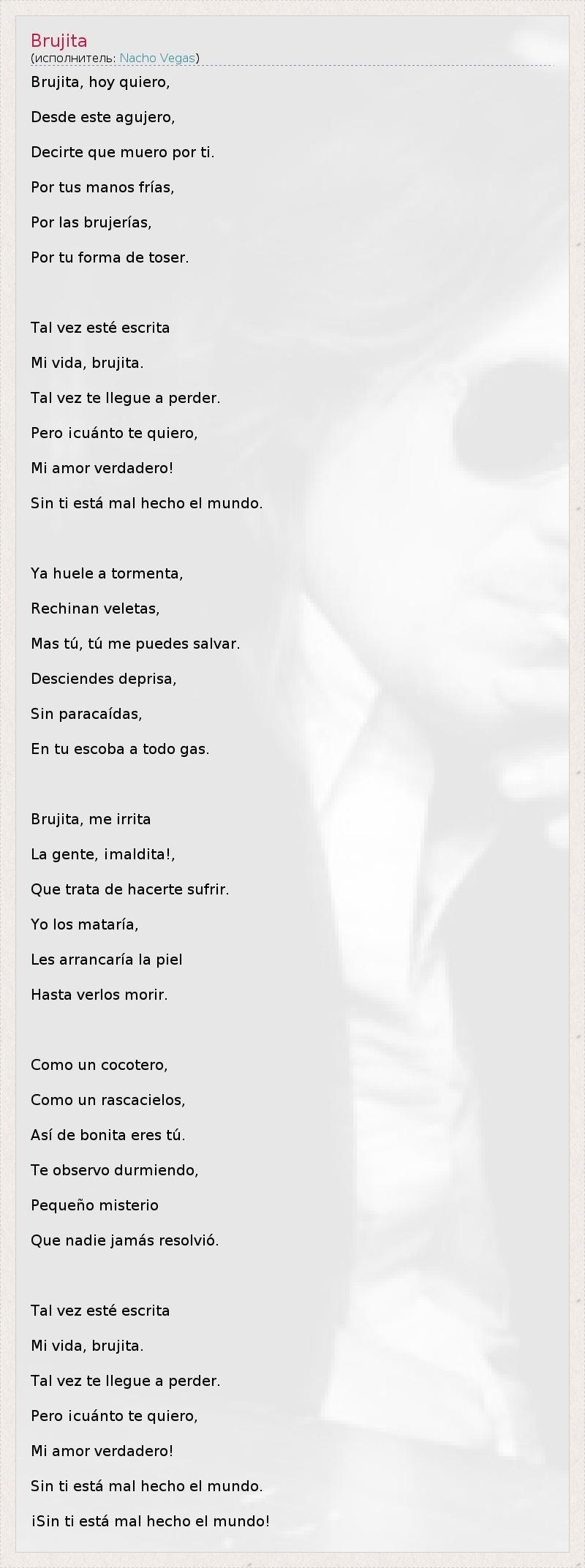 Brujita, hoy quiero, Desde este agujero, Decirte que muero por ti. Por tus manos frías, Por las brujerías, Por tu forma de toser. Tal vez esté escrita Mi vida, brujita. Tal vez te llegue a perder. Pero ¡cuánto te quiero, Mi amor verdadero! Sin ti está mal hecho el mundo. Ya huele a tormenta, Rechinan veletas, Mas tú, tú me puedes salvar. Desciendes deprisa, Sin paracaídas, En tu escoba a todo gas. Brujita, me irrita La gente, ¡maldita!, Que trata de hacerte sufrir. Yo los mataría, Les arrancaría la piel Hasta verlos morir. Como un cocotero, Como un rascacielos, Así de bonita eres tú. Te observo durmiendo, Pequeño misterio Que nadie jamás resolvió. Tal vez esté escrita Mi vida, brujita. Tal vez te llegue a perder. Pero ¡cuánto te quiero, Mi amor verdadero! Sin ti está mal hecho el mundo. ¡Sin ti está mal hecho el mundo!