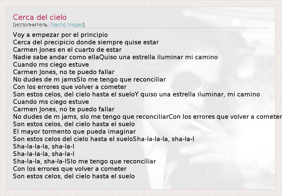 Voy a empezar por el principio Cerca del precipicio donde siempre quise estar Carmen Jones en el cuarto de estar Nadie sabe andar como ellaQuiso una estrella iluminar mi camino Cuando ms ciego estuve Carmen Jones, no te puedo fallar No dudes de m jamsSlo me tengo que reconciliar Con los errores que volver a cometer Son estos celos, del cielo hasta el sueloY quiso una estrella iluminar, mi camino Cuando ms ciego estuve Carmen Jones, no te puedo fallar No dudes de m jams, slo me tengo que reconciliarCon los errores que volver a cometer Son estos celos, del cielo hasta el suelo El mayor tormento que pueda imaginar Son estos celos del cielo hasta el sueloSha-la-la-la, sha-la-l Sha-la-la-la, sha-la-l Sha-la-la-la, sha-la-l Sha-la-la, sha-la-lSlo me tengo que reconciliar Con los errores que volver a cometer Son estos celos, del cielo hasta el suelo